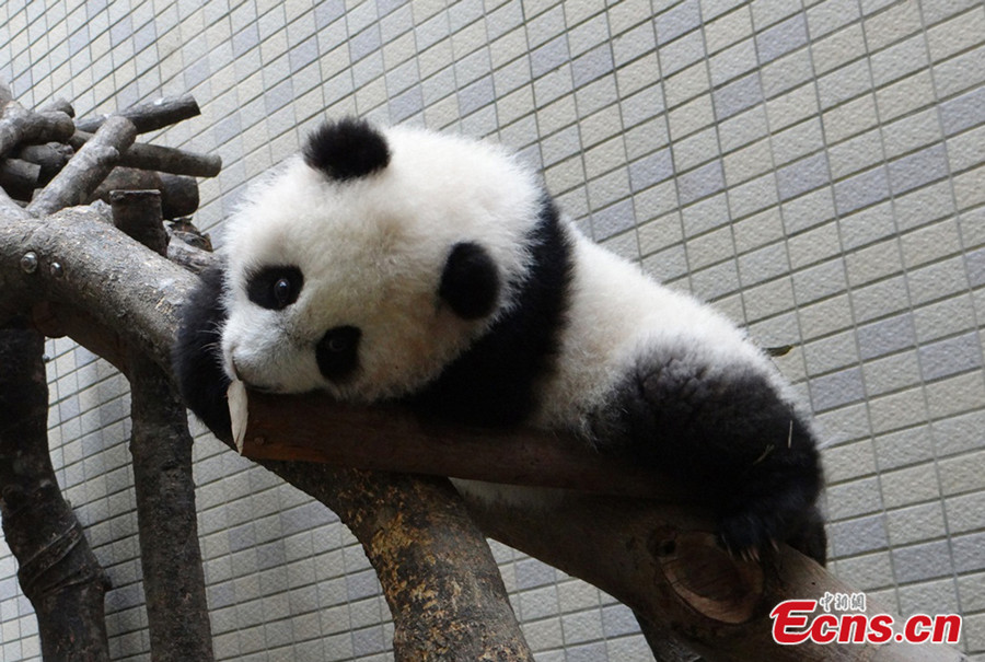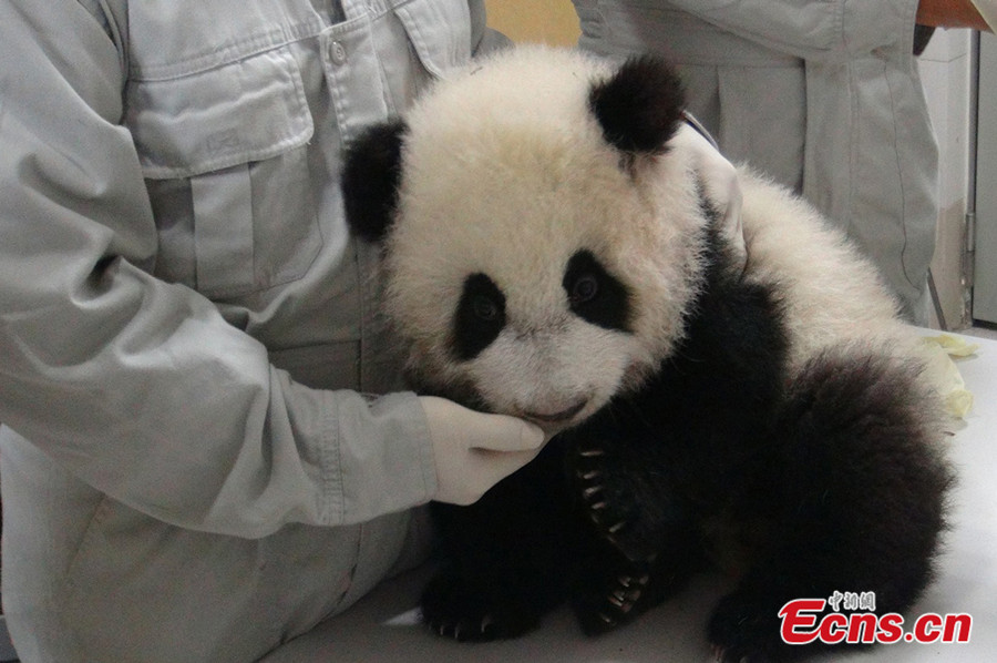 Five-month-old Yuanzai receives health checkup at Taipei Zoo on December 7, 2013. Yuanzai, who was born on July 6, is the first cub born to Yuan Yuan and her mate Tuan Tuan, who were gifts to Taiwan from the Chinese mainland in 2008. [Photo provided by Taipei Zoo]
