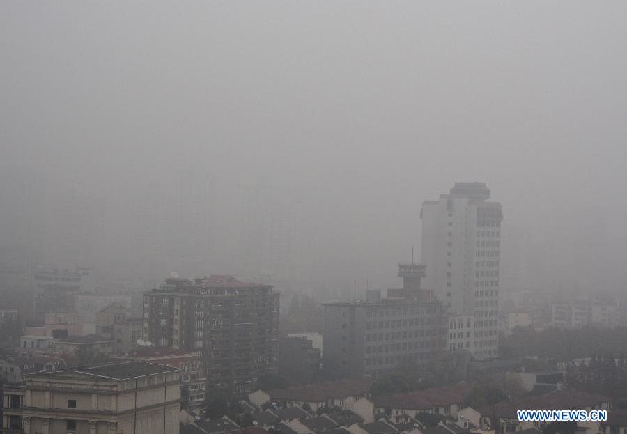 Two visitors pass by the Bund in Shanghai, east China, Dec. 9, 2013. Heavy smog and fog continued to hit Shanghai on Monday. (Xinhua/Pei Xin)