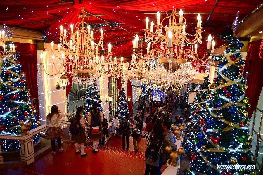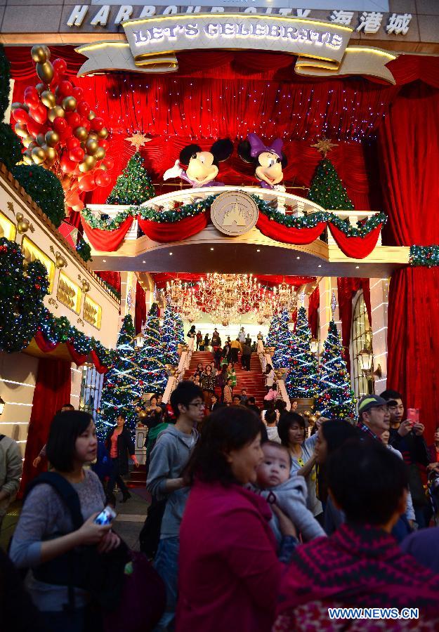 People pose with cartoon sculptures at the Harbour City Shopping Mall in Hong Kong, south China, Dec. 9, 2013. With the coming of Christmas, shopping centers in Hong Kong started to put on festive decorations to attract customers. (Xinhua/Qin Qing)