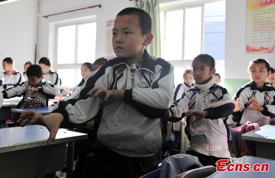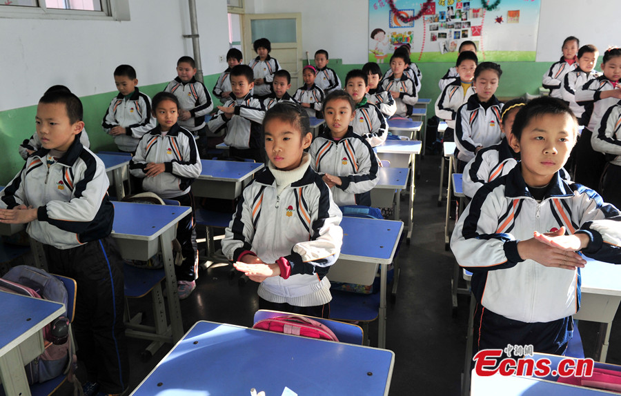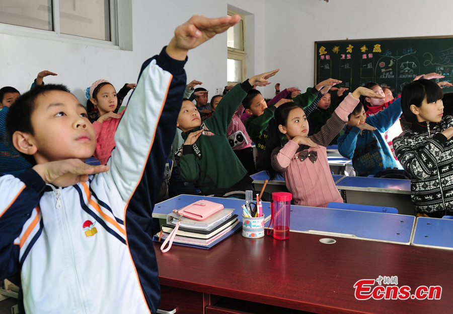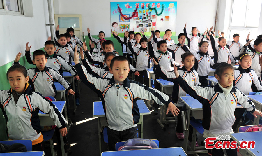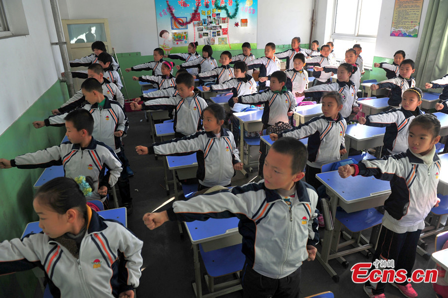 Primary school students in Shijiazhuang of Hebei province practice martial arts gestures in classroom on Dec 11, 2013. The school invented an aerobic exercise with martial arts gestures to protect students against smog. [Photo: China Service / Zhai Yujia]