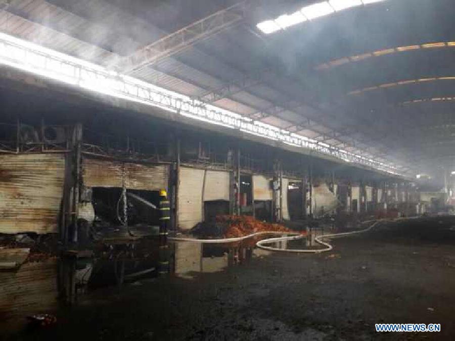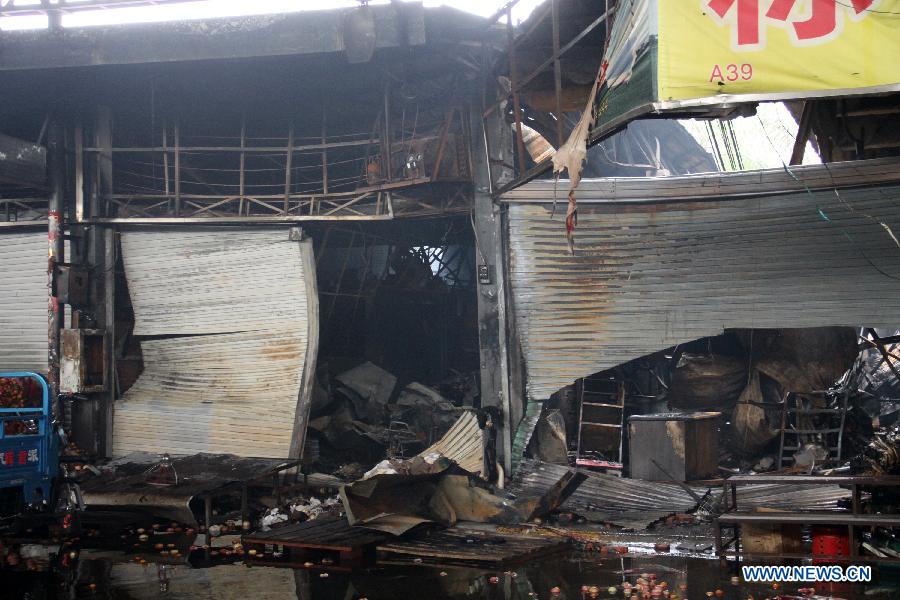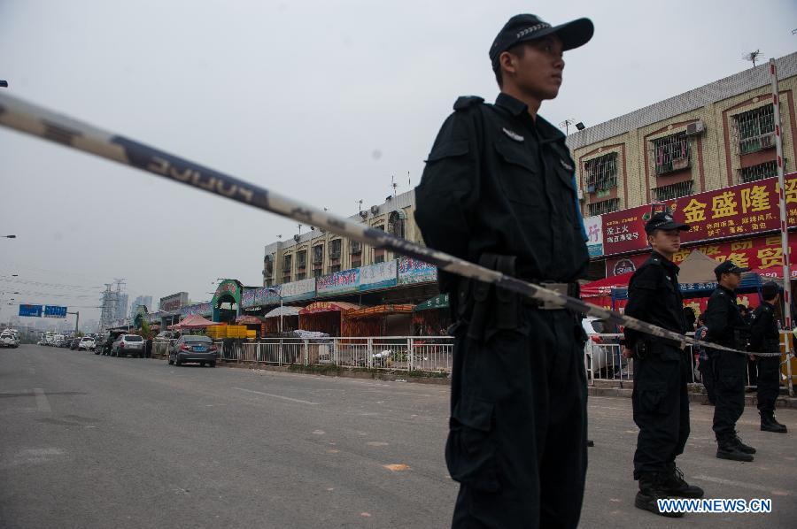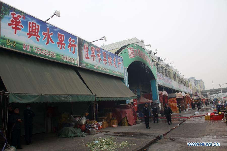 Policemen cordon off a market where fire took place in Shenzhen, south China's Guangdong Province, Dec. 11, 2013. As of 12:00 a.m., 16 people were killed and 5 others injured after a fire broke out in the market in south China's Shenzhen early Wednesday. The cause of the fire is under investigation. (Xinhua/Mao Siqian)