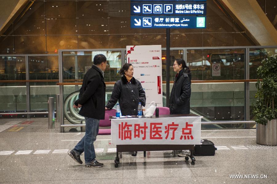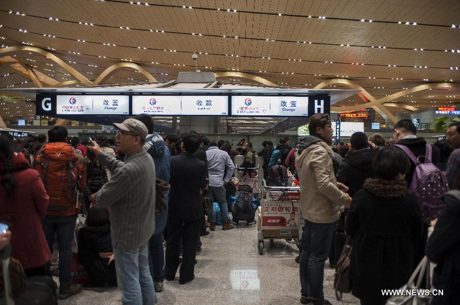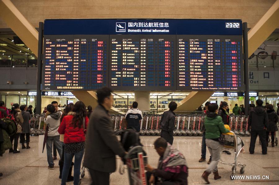 Stranded passengers eat free packed meal at the terminal building of the airport of Kunming, capital of southwest China's Yunnan province, Dec 15, 2013. Kunming, the Spring City, witnessed a snowfall from Sunday to early Monday due to the advent of severe cold air. Snow began to affect the airport at 9 a.m. (0100 GMT) on Sunday. As many as 259 flights have been canceled as of midnight of Sunday, according to the airport. (Xinhua/Zhang Keren)