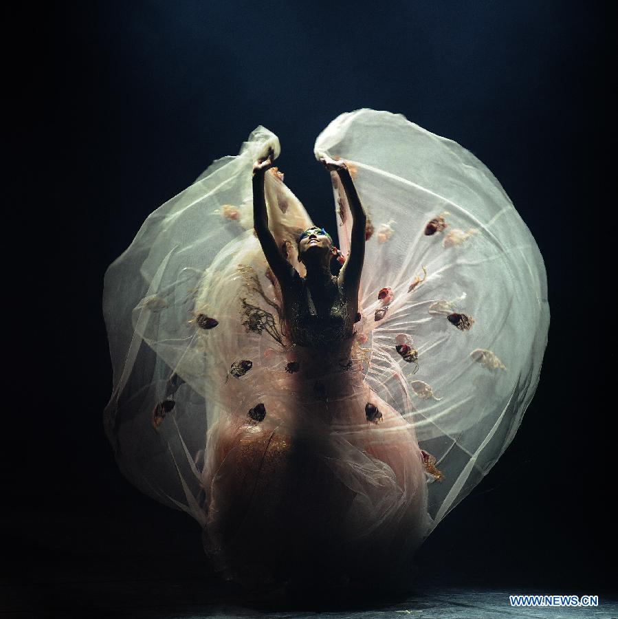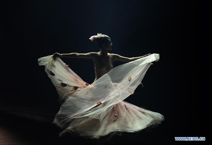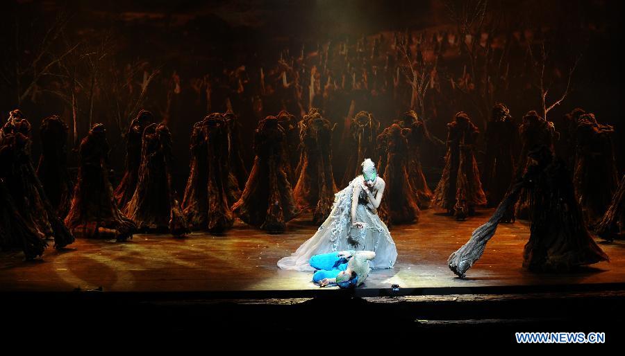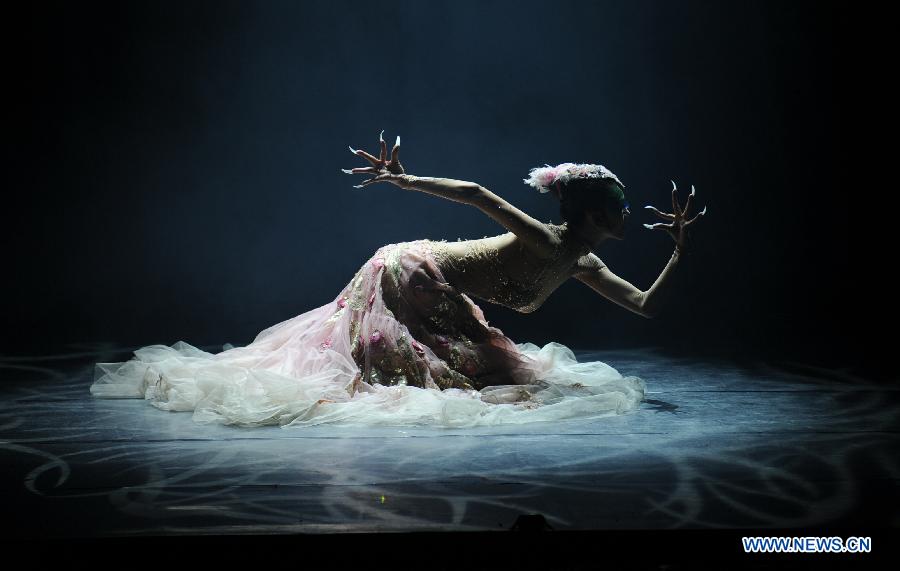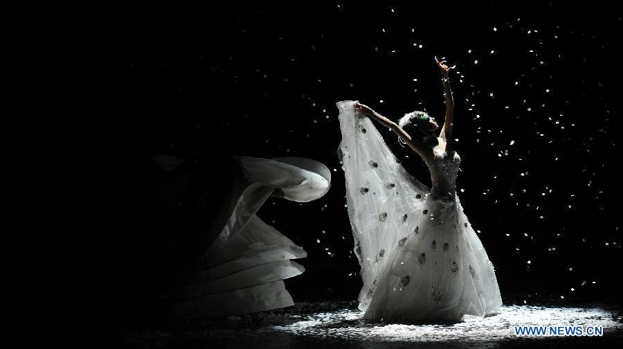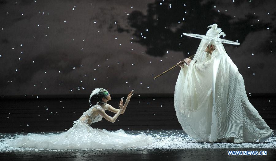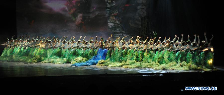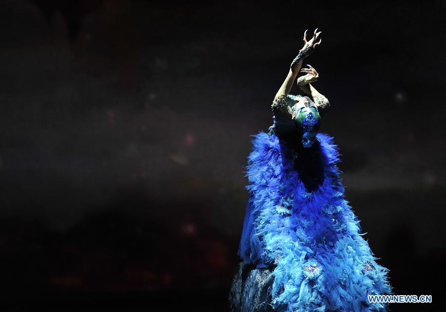 Chinese dancing master Yang Liping (L) performs in her dance drama "The Peacock" during the first Yang Liping International Dance Festival in Kunming, capital of southwest China's Yunnan Province, Dec. 19, 2013. The 20-day festival will end on Dec. 25. (Xinhua/Qin Lang)