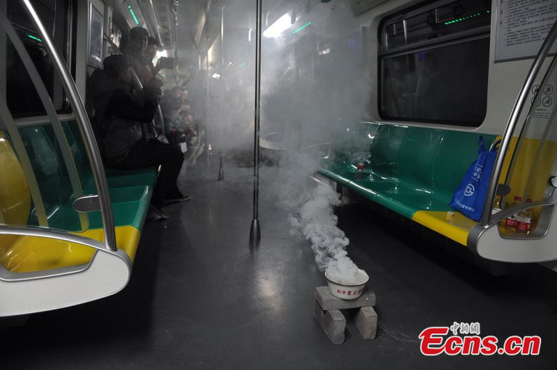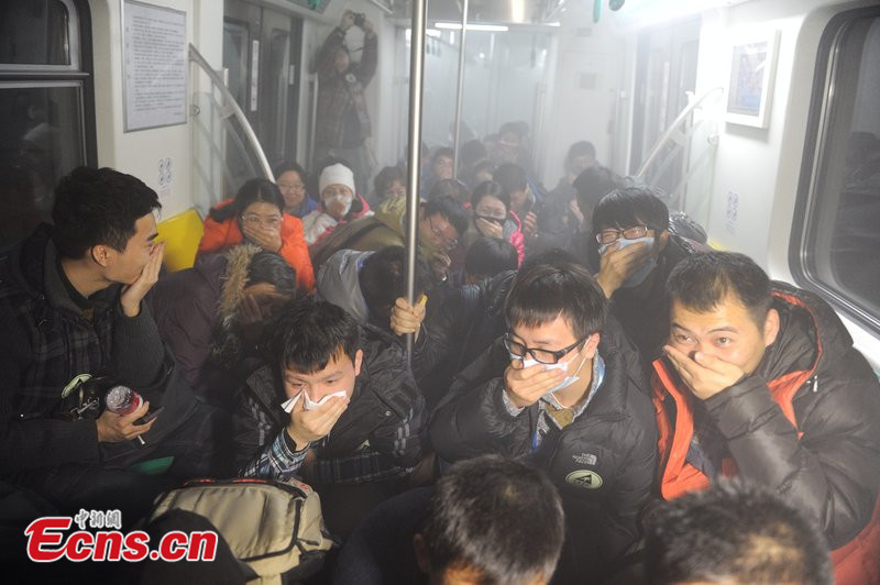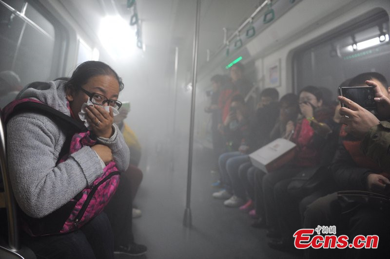 Under the guidance of Traffic Transportation Bureau, passengers take part in subway emergency evacuation drill at the opening Nanluoguxiang station in line 8 on December 19th, 2013. There are 100 passengers joined in the whole course of the drill, which is different from the past. [Photo/CFP]