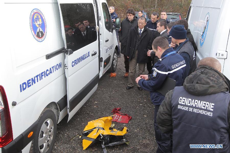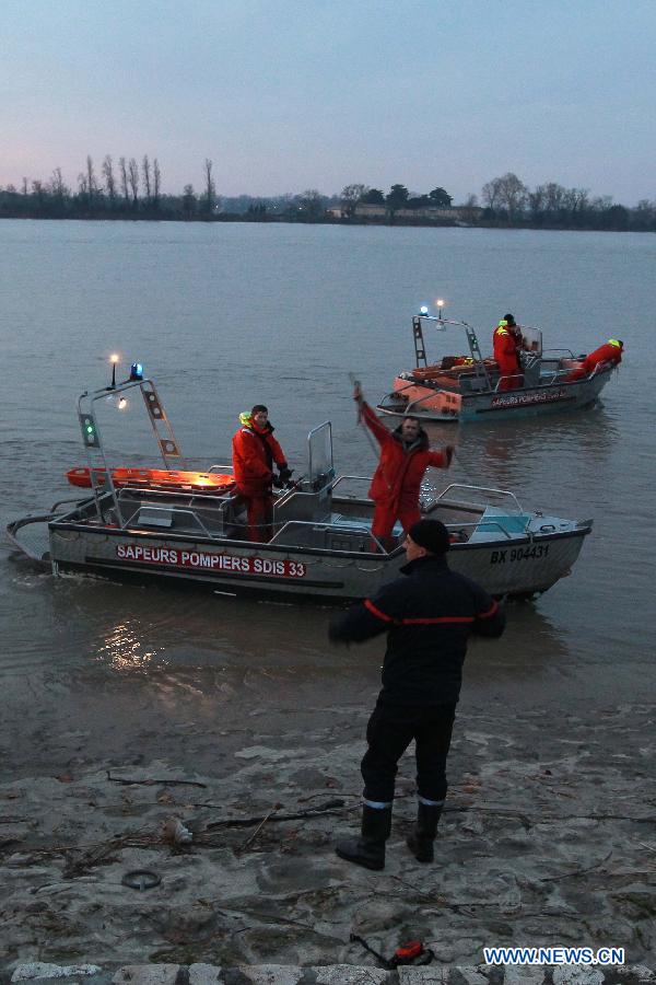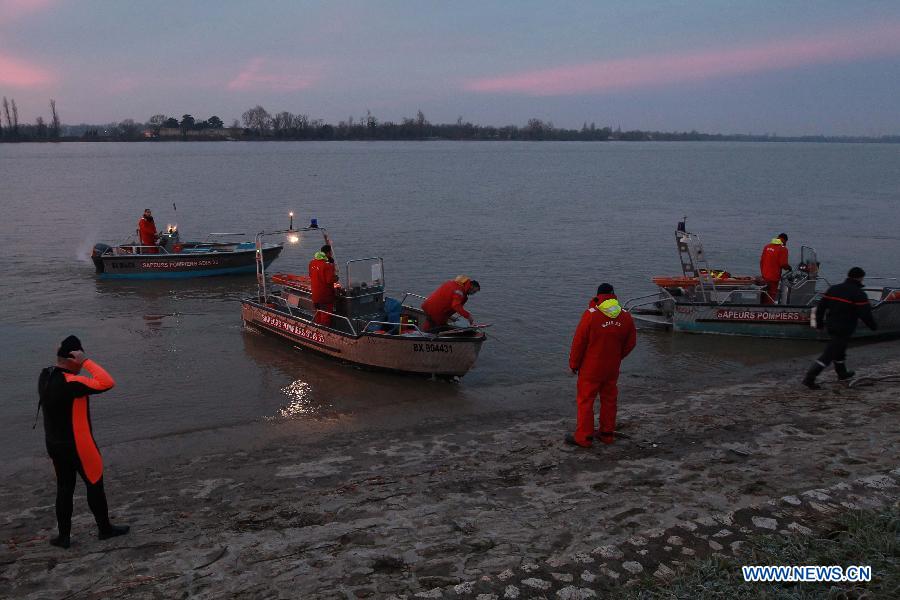 Rescuers work on the boats on the Dordogne River at the site of a helicopter crash in Lugon-et-l'e-du-Carnay, France, Dec. 20, 2013. Rescue teams scoured the Dordogne river in southwestern France after a helicopter carrying three Chinese went down on Friday. (Xinhua/Fabien Cottereau)
