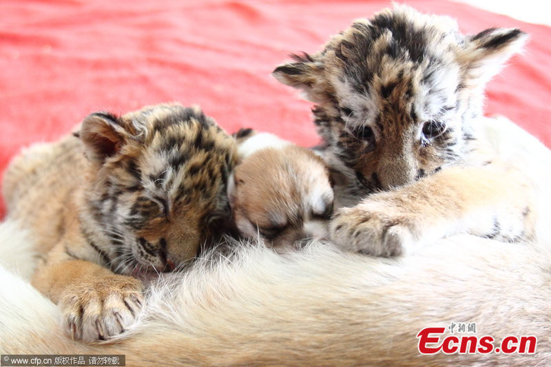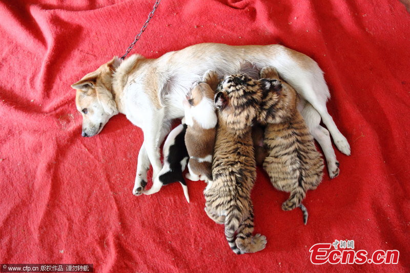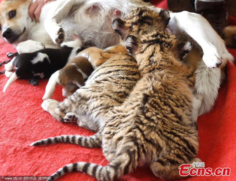 A dog feeds two Siberian tiger cubs and its own children at Hangzhou Safari Park in Hangzhou, capital city of east China's Zhejiang province on Dec 22, 2013. The two baby tigers were born on Nov 10 but their mom refused to feed them. [Photo/CFP]
