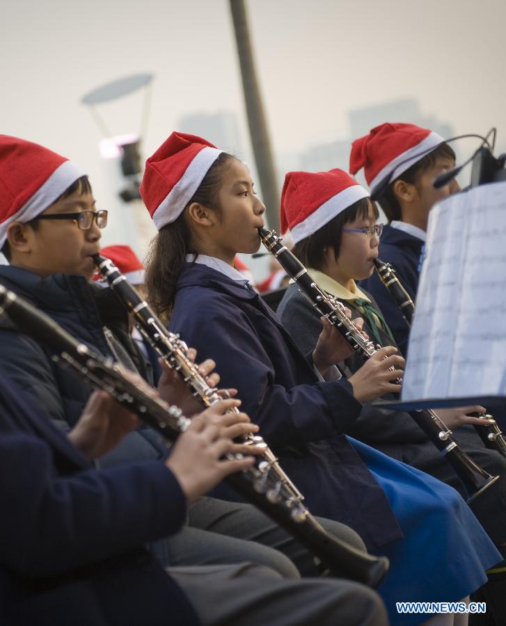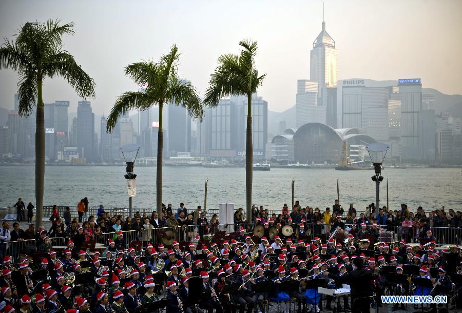 More than 400 students play music celebrating the Christmas season in Hong Kong, south China, Dec 23, 2013. (Xinhua/Liu Siu Wai)