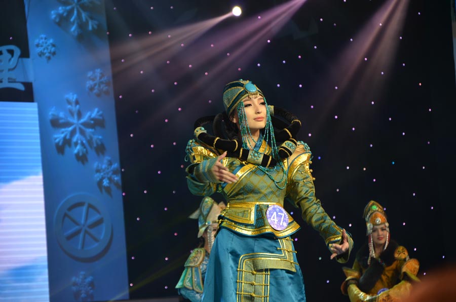 The pageant winners, including the champion Butykova Tamara (M) pose on stage at the 10th Miss International of China, Russia and Mongolia in China’s border city Manzhouli, December 24, 2013. Forty beauty contestants who stood out from the previous rounds competed in the final round of the international beauty competition. The beauty pageant was comprised of three categories including traditional folk costumes, swimsuit and evening wear. In the end, Butykova Tamara from Russia was crowned the champion. Pan Xiaotong and Chen Xi, both from China, finished second and third. [Photo by Bi Nan/chinadaily.com.cn]