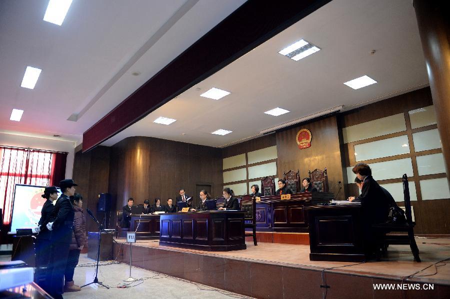 Zhang Shuxia, who is involved in a baby trafficking scandal, stands trial in Weinan Intermediate People's Court in Weinan, northwest China's Shaanxi Province, Dec. 30, 2013. Zhang was a doctor with the Fuping County Maternal and Child Health Care Hospital in the province and was detained by police in connection with trafficking of babies in August. (Xinhua/Li Yibo)