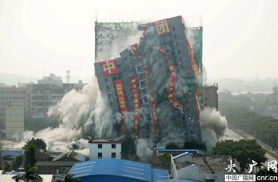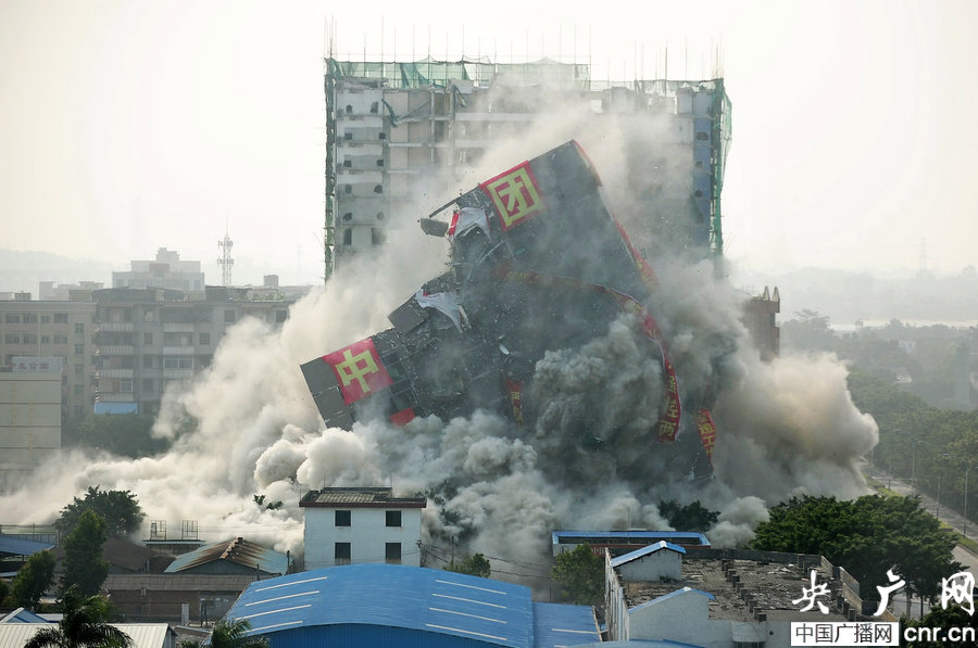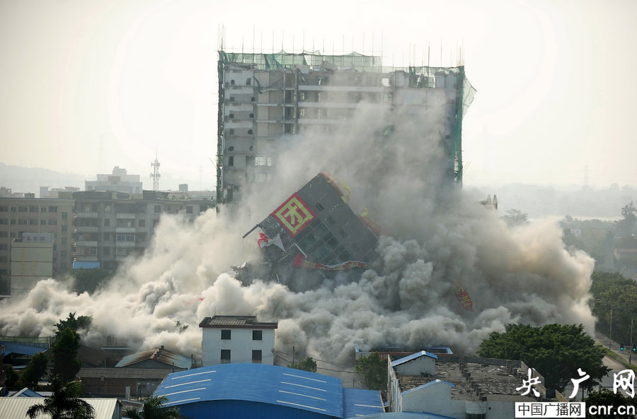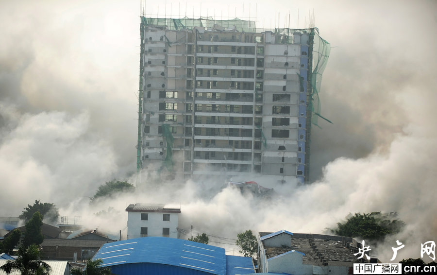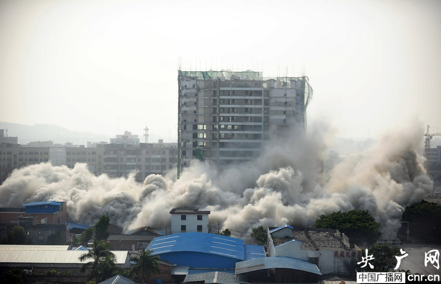 A 18-storey apartment building newly constructed without license falls to the ground in blasts arranged by the local authorities on Dec 28, 2013. [Photo: CNR]