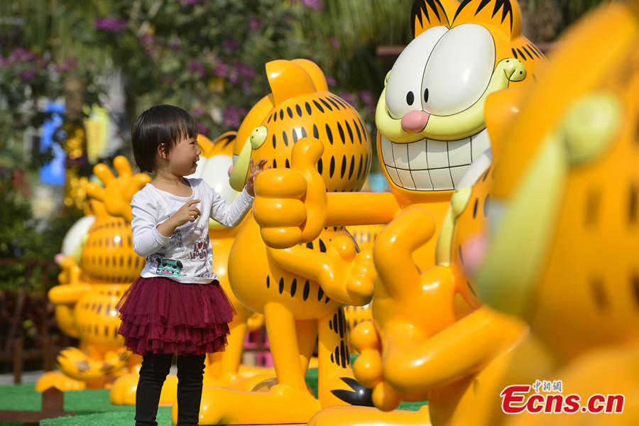 A total of 35 Garfield cartoon dolls are exhibited at a cultural festival to mark its 35th anniversary of birth in Sanya, south China's Hainan province on January 1, 2014. [Photo: China News Service / Luo Yunfei]
