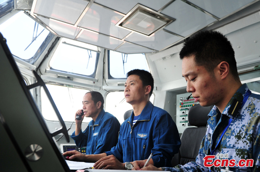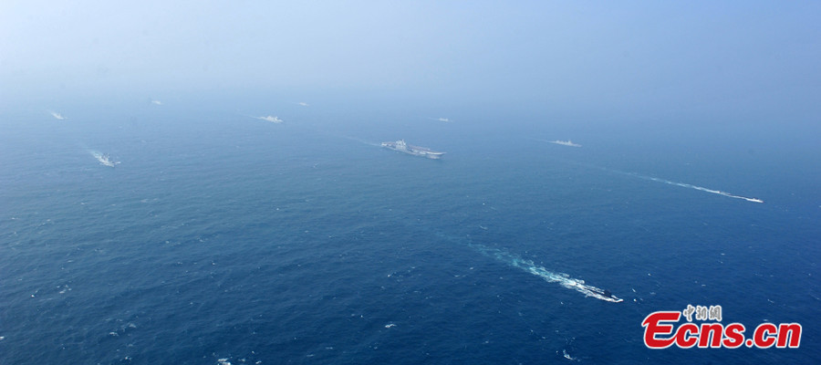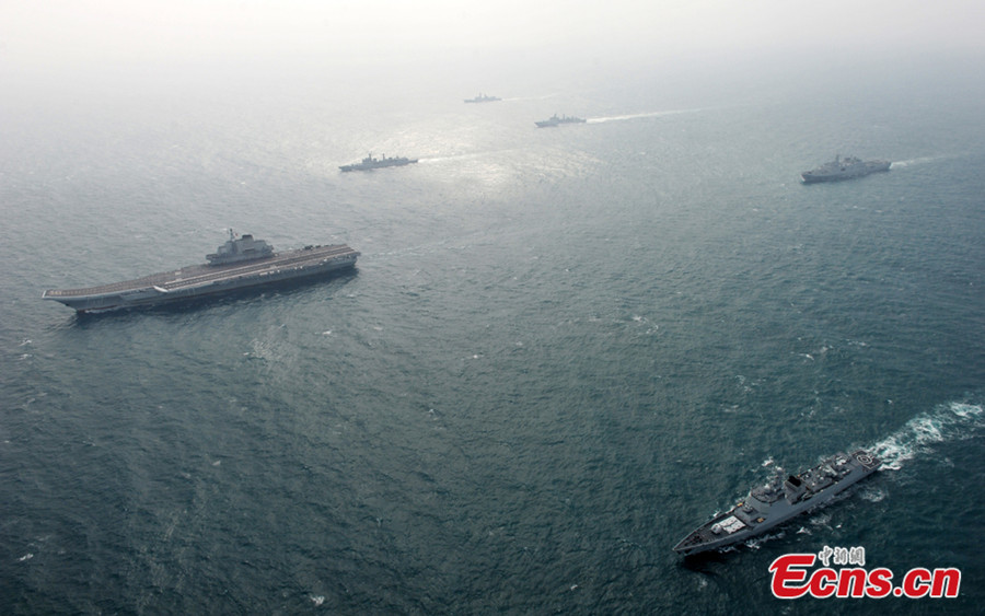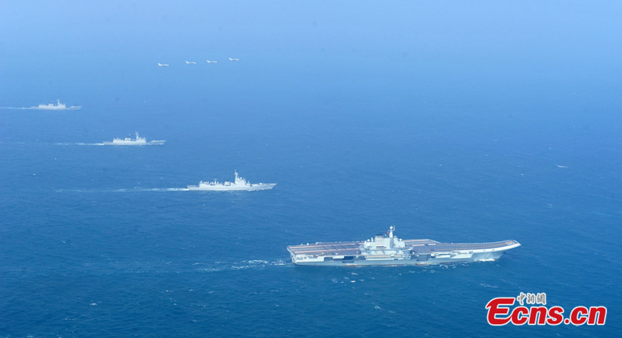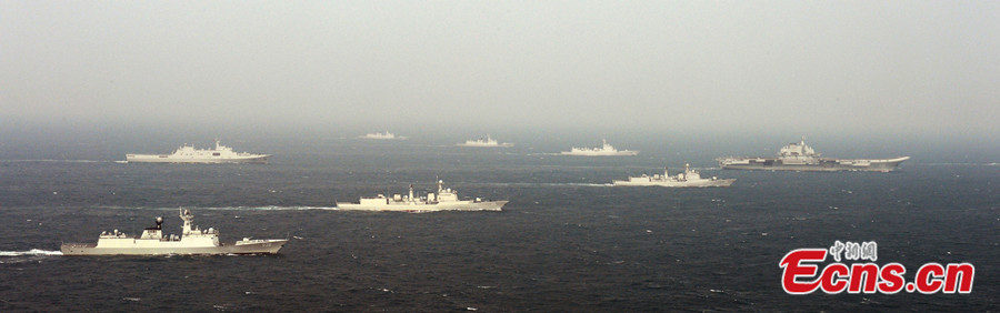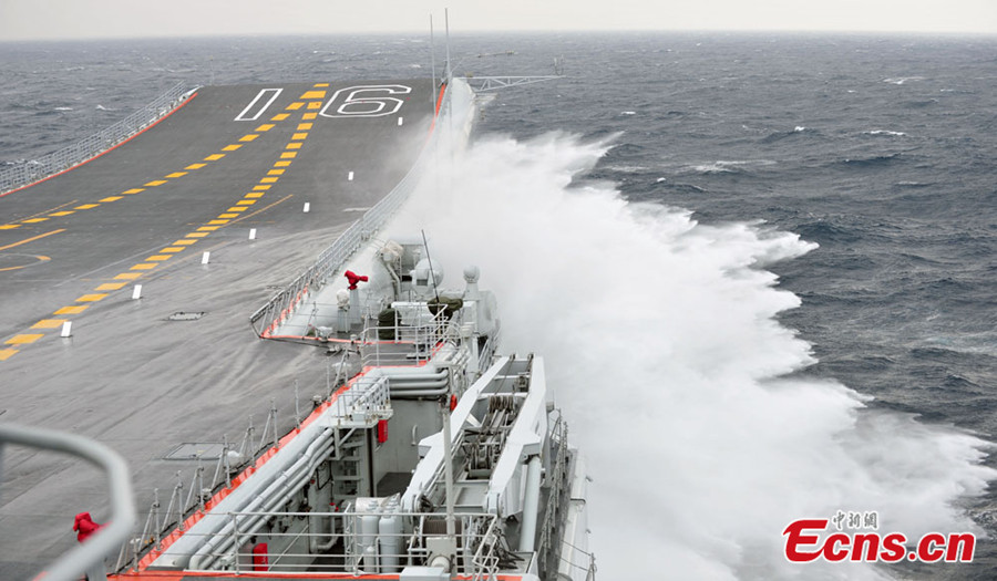 China's first aircraft carrier, the Liaoning, returned to its homeport in Qingdao of east China's Shandong province on Jan 1, 2014 after completing a series of scientific tests and training programs in the South China Sea. The aircraft carrier underwent a comprehensive test of its combat system and conducted a formation practice during the 37-day voyage. Photo shows the aircraft carrier tests its seagoing capability. [Photo: China News Service / Hu Kaibing]