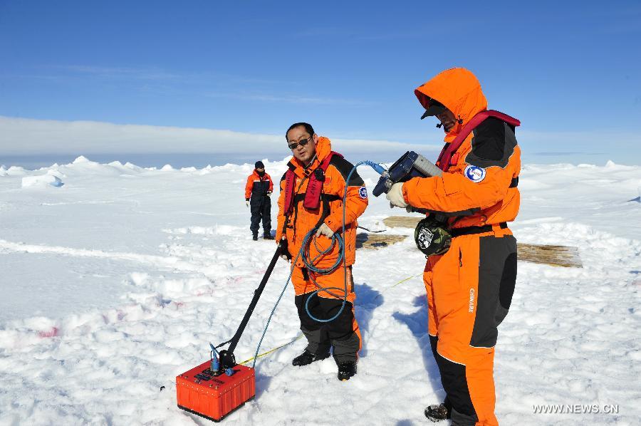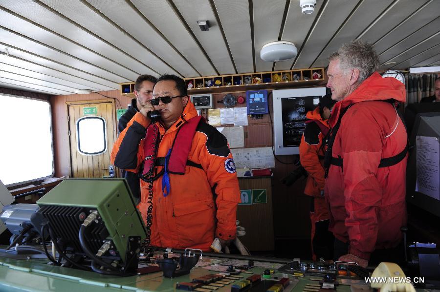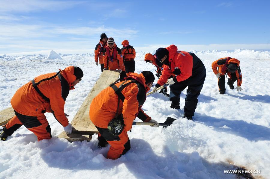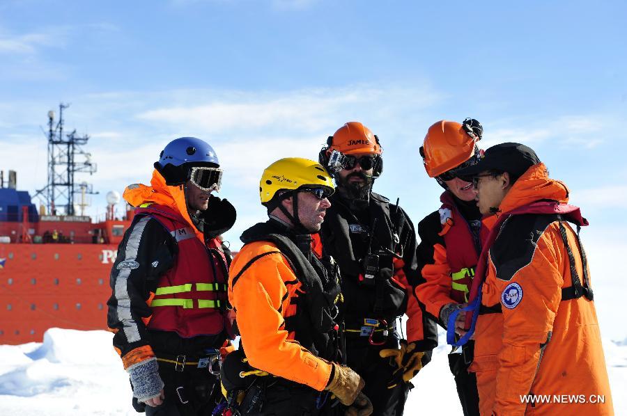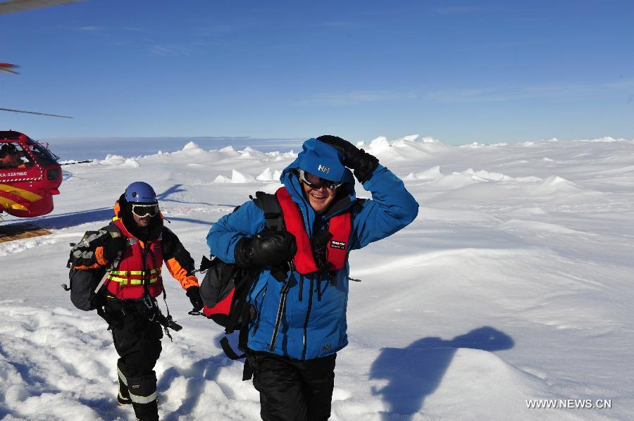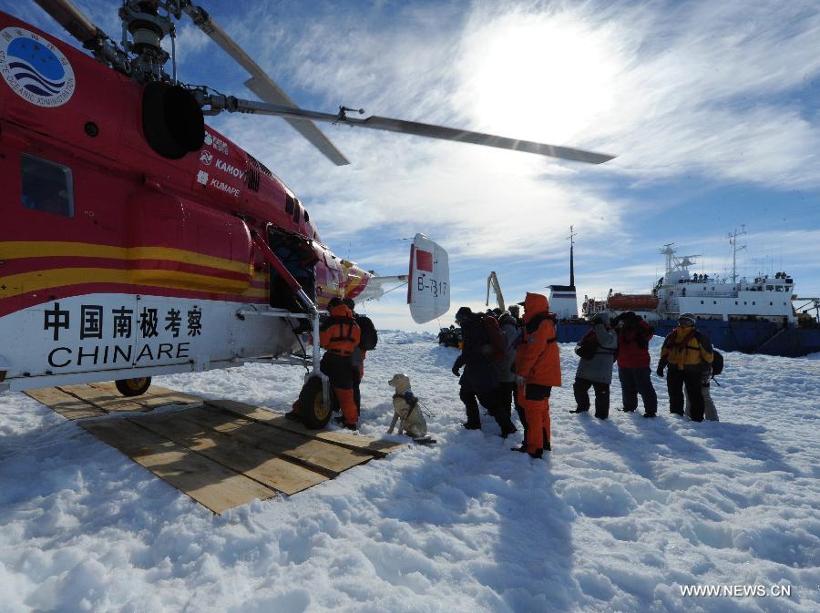 Passengers from the trapped Russian vessel MV Akademik Shokalskiy prepare to board the Chinese helicopter Xueying 12 off the Antarctic, Jan. 2, 2014. Passengers aboard Akademik Shokalskiy were successfully transferred by Chinese helicopter to ice surface near Australian rescue ship Aurora Australis on Thursday after the Russian vessel got stuck in sea ice off the Antarctic. (Xinhua/Zhang Jiansong)