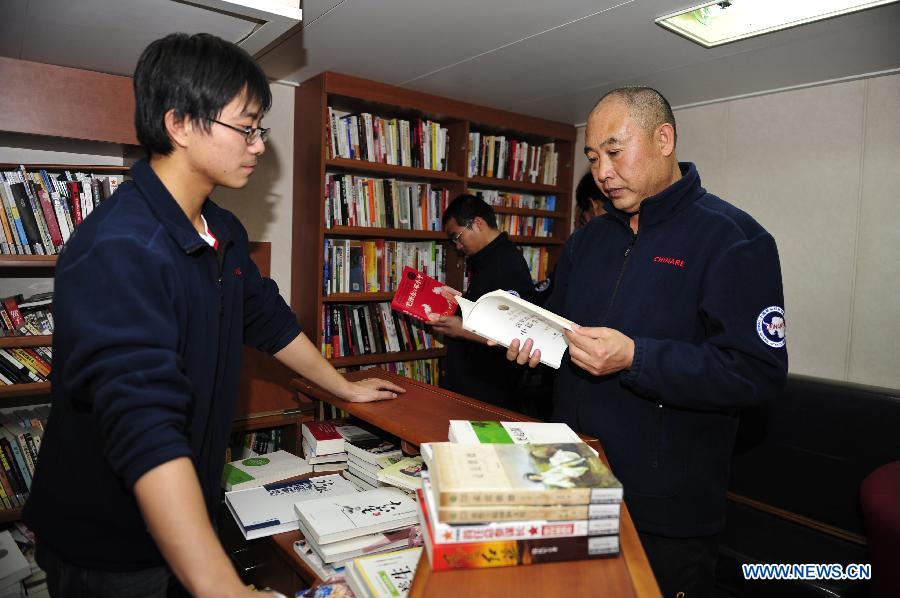 Members of Chinese Antarctic exploration team read books at a library on the icebreaker Xuelong, or Snow Dragon, in Antarctica, Jan. 5, 2014. The icebreaker has been trapped by heavy floes since it rescued passengers on a Russian vessel stranded in Antarctica. Parts of the scientific research on Xuelong are underway while all crew and passengers aboard the research vessel are making efforts to get out of trouble. (Xinhua/Zhang Jiansong)