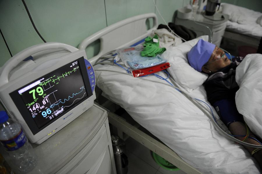 An injured woman receives medical treatment at a hospital in Xiji Town of Guyuan City, northwest China's Ningxia Hui Autonomous Region, Jan 5, 2013. Fourteen people were killed and ten people injured in a stampede during a religious gathering in Xiji Sunday afternoon, according to the local government. The stampede occurred during the process of handing out traditional religious food to attendees at an event to commemorate a late religious figure in a mosque. (Xinhua/Li Ran)