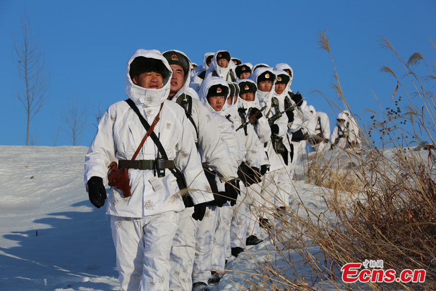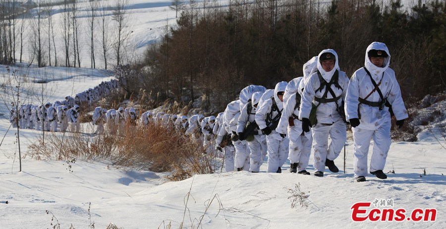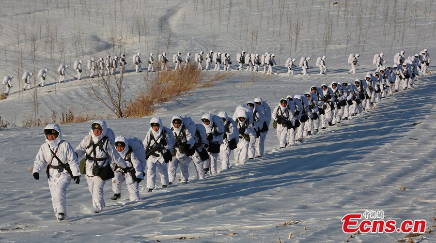 A "Red Army" division under the Shenyang Military Area Command of the Chinese People's Liberation Army (PLA) takes its troops to snow-covered forests to conduct winter training in Northeast China on Jan 4, 2013. [Photo: China News Sesrvice / Li Xianghui]