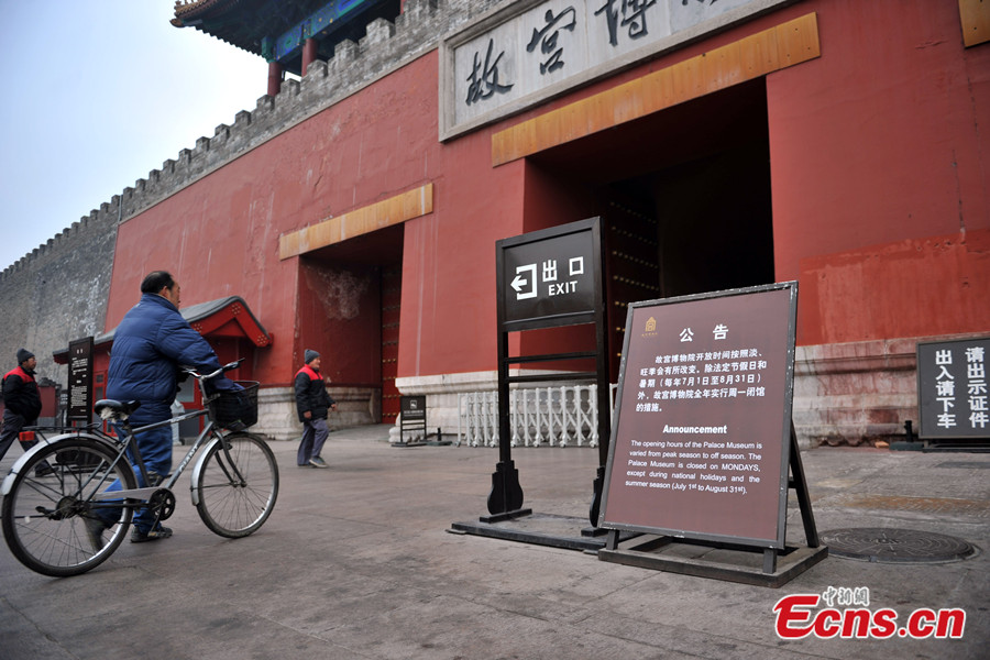The Forbidden City, also known as the Palace Museum, is closed to the public every Monday for renovation and maintenance starting on Jan. 6. But on public days and Mondays during July 1 to Aug. 31, the museum will still be opened. [Photo: Chinanews.com / Jin Shuo]
