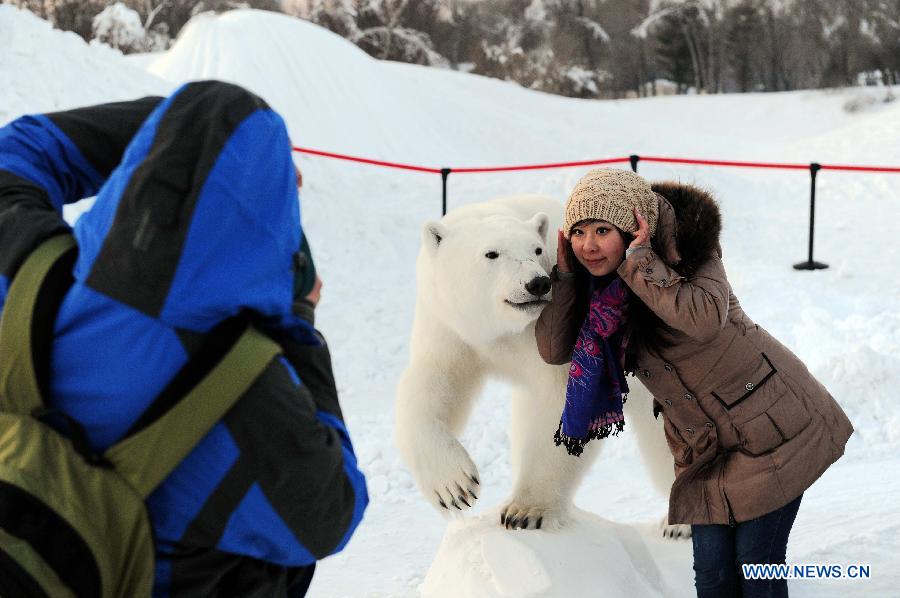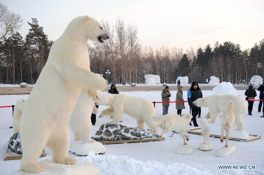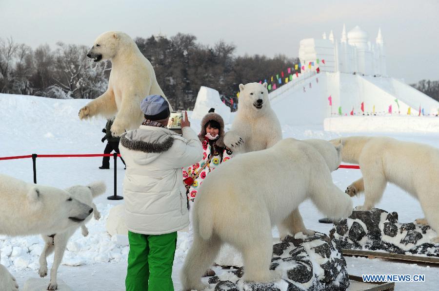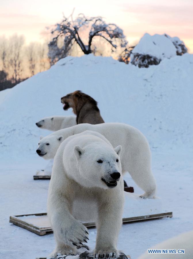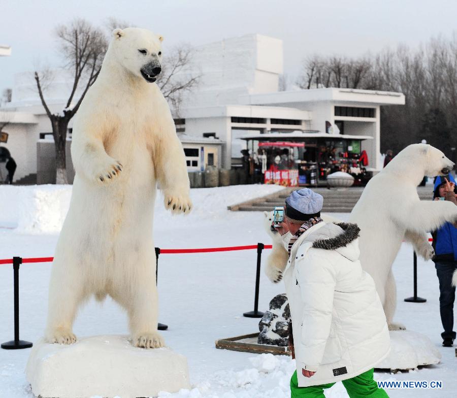Stuffed polar bears are displayed at the International Snow Sculpture Expo in Harbin, capital of northeast China's Heilongjiang Province, Jan. 6, 2014. (Xinhua/Wang Song)