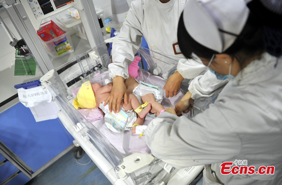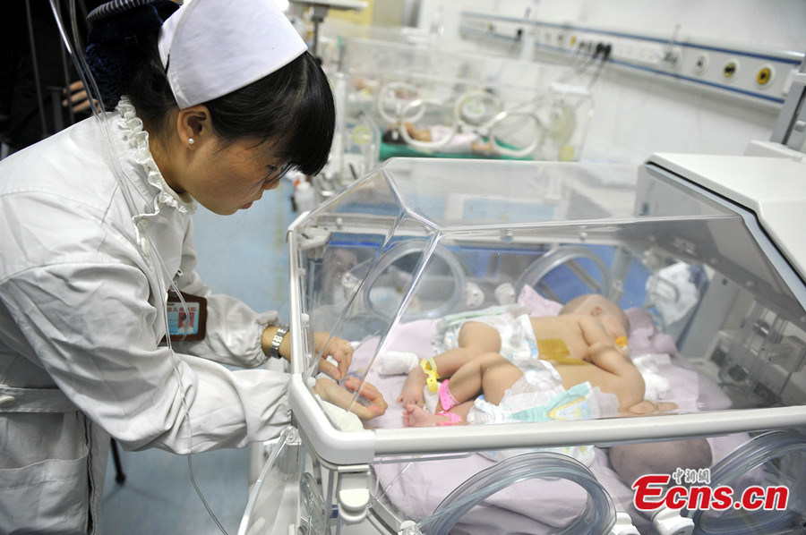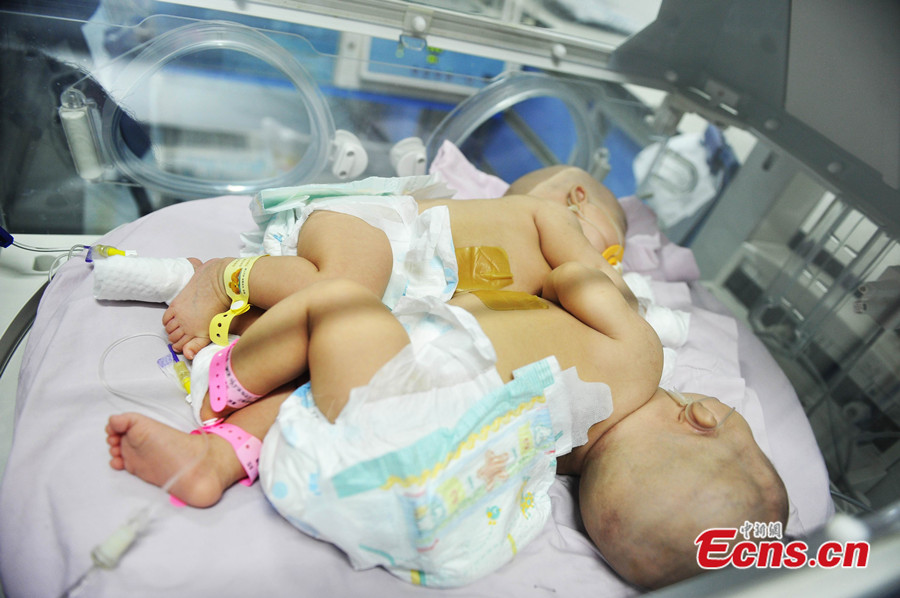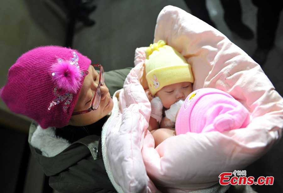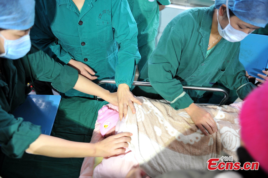 The mother cuddles the conjoined babies who will undergo a surgery to be separated in Jiangxi province on Jan 7, 2014. [Photo: Liu Zhankun]