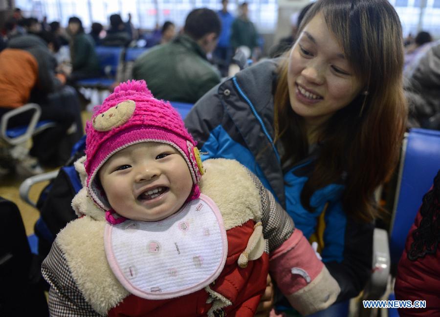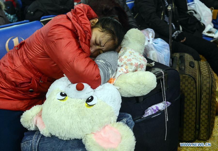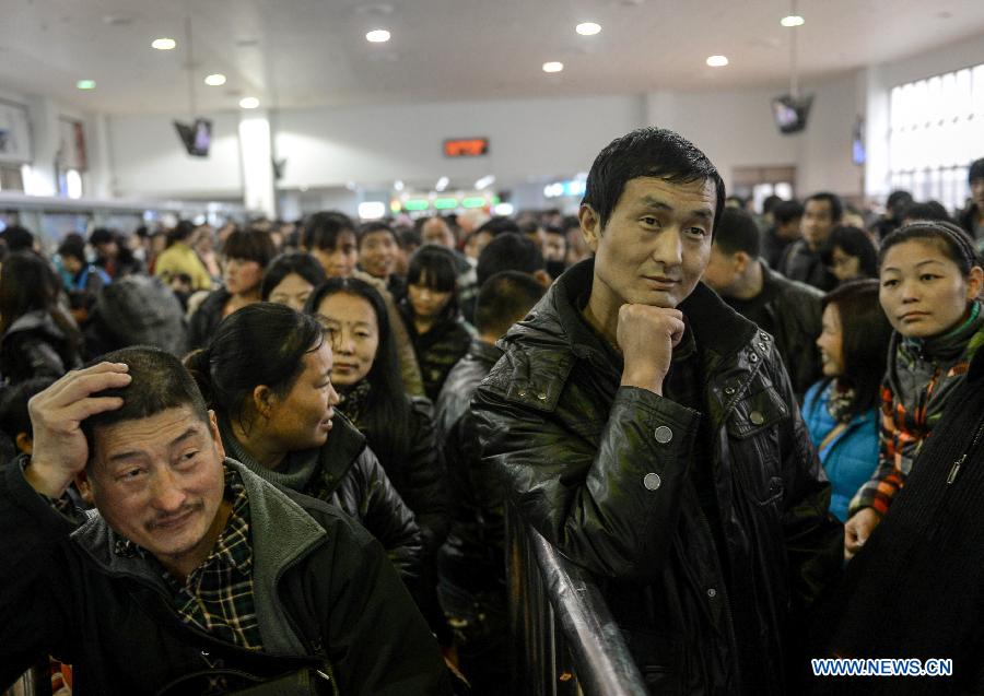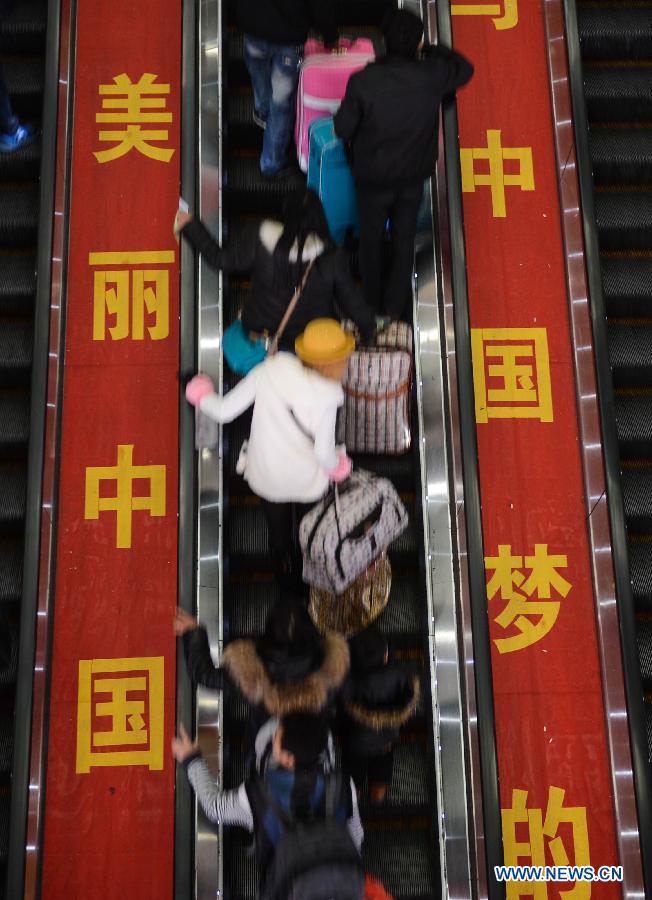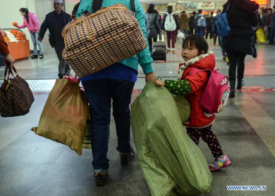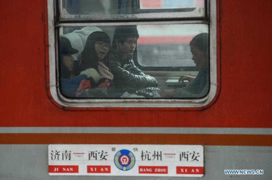 Passengers are seen aboard a train heading for Xi'an at Hangzhou Railway Station in Hangzhou, capital of east China's Zhejiang Province, Jan. 7, 2014. Immigrants workers in Zhejiang started to leave for home ahead of the upcoming China's Spring Festival travel rush, during when passenger volume in Zhejiang will reach 220 million according to estimation. (Xinhua/Han Chuanhao)