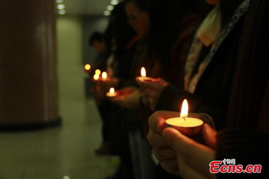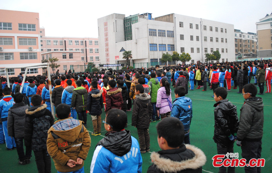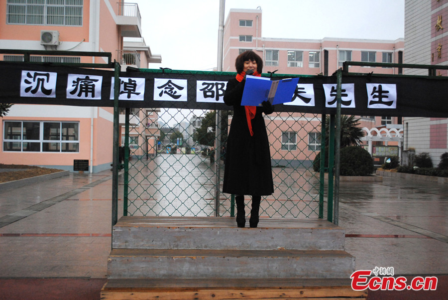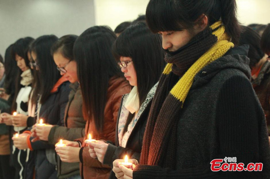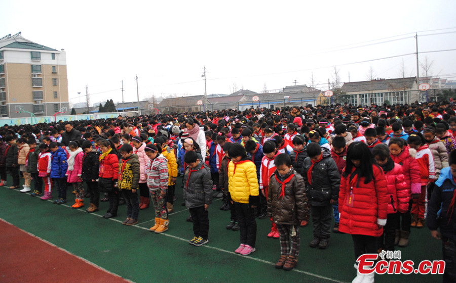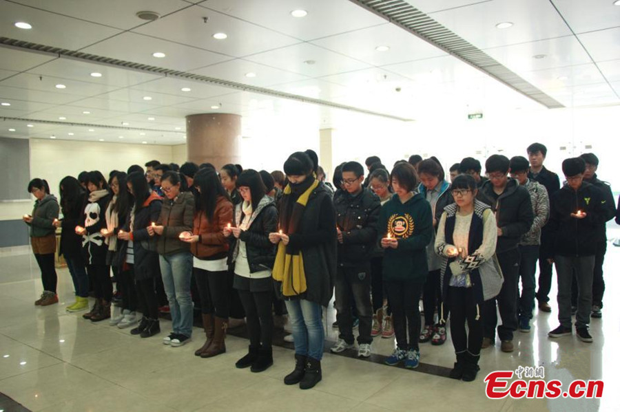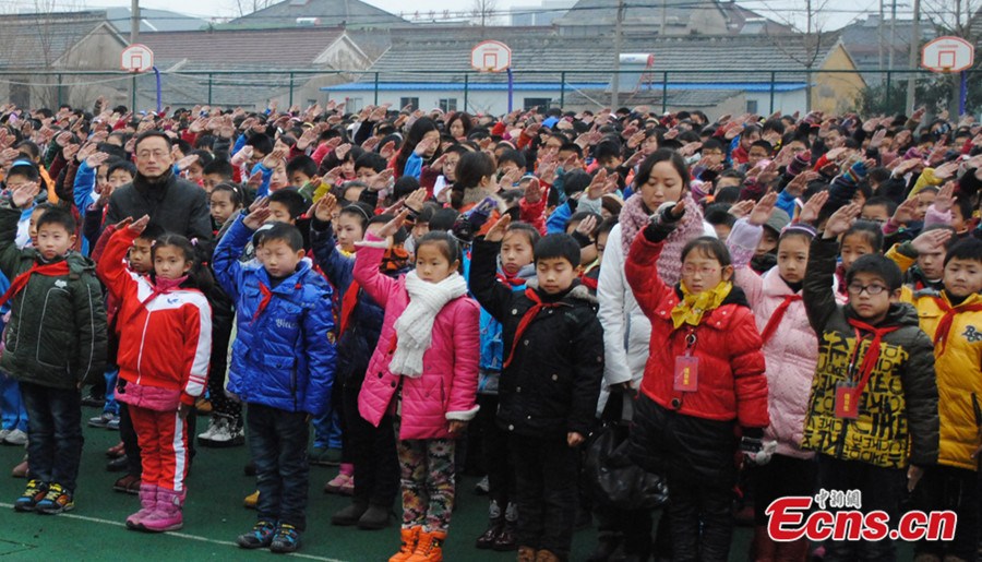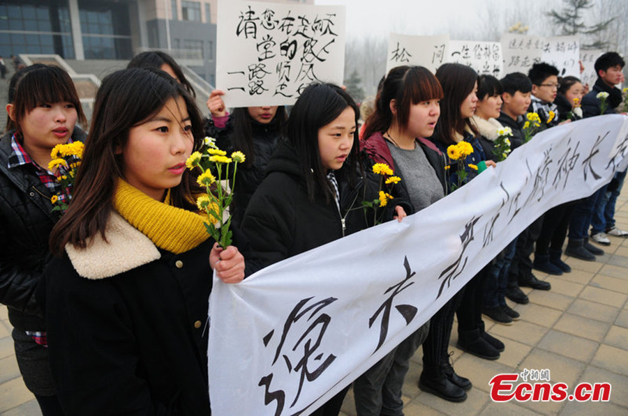 Students attend an event to mourn the death of Run Run Shaw at Liaocheng University in Liaocheng city of east China's Shandong province on Jan. 7 2014. Hong Kong entertainment mogul and philanthropist Run Run Shaw died at the age of 107 at home in Hong Kong on Tuesday. [Photo/CFP]