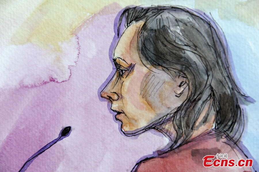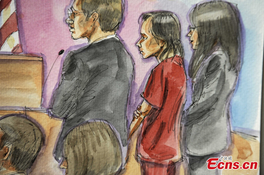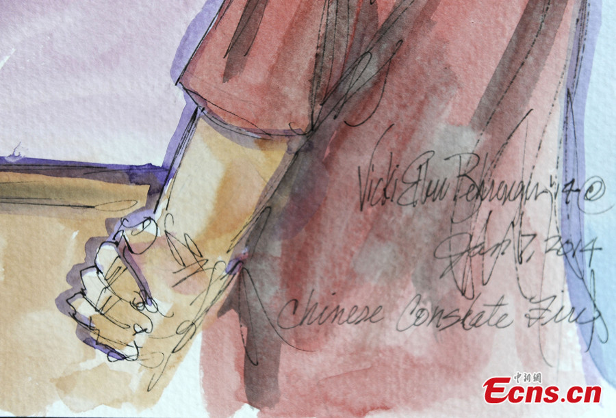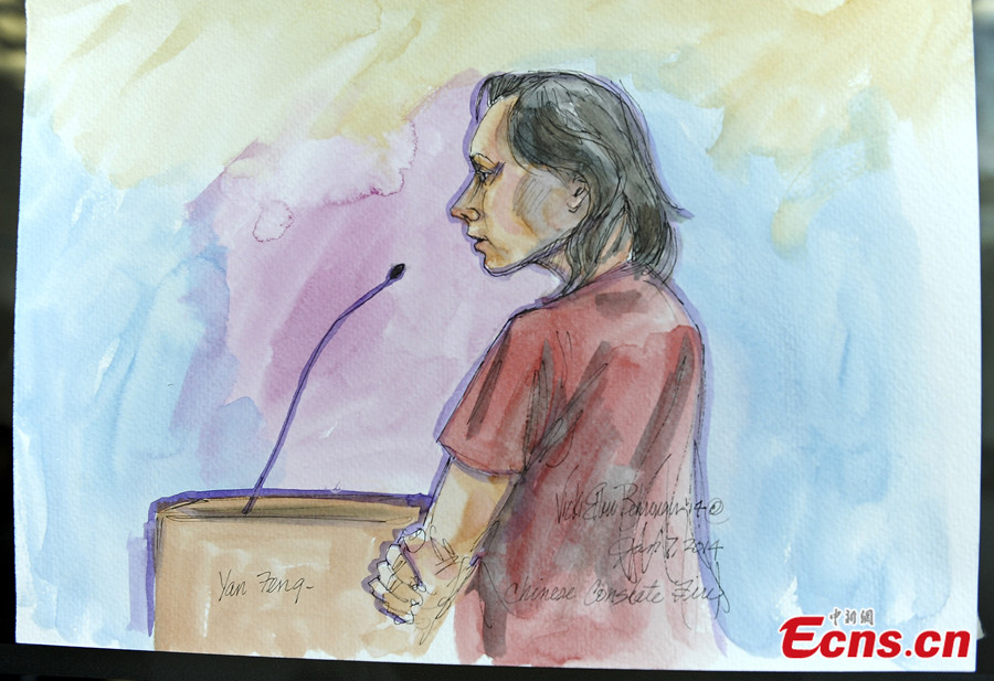 Yanfeng Feng, the man accused of setting Chinese Consulate General in San Francisco on fire, appeared in court on Jan 7, 2014 (local time). Photo shows the scene of Yanfeng Feng in court drawn by the court painter Vicki Ellen Bebringer. [Photo: China News Service / Chen Gang]