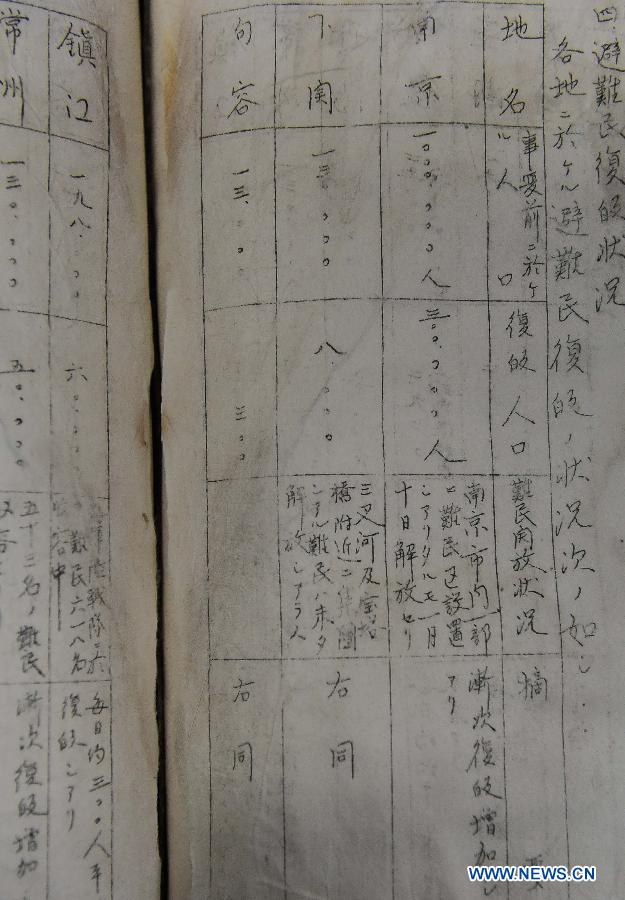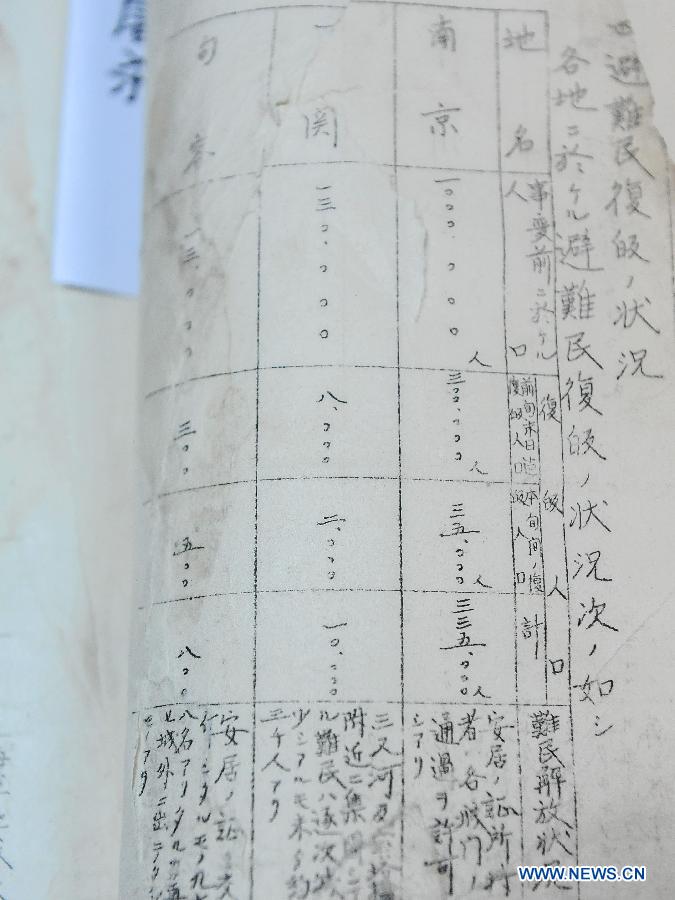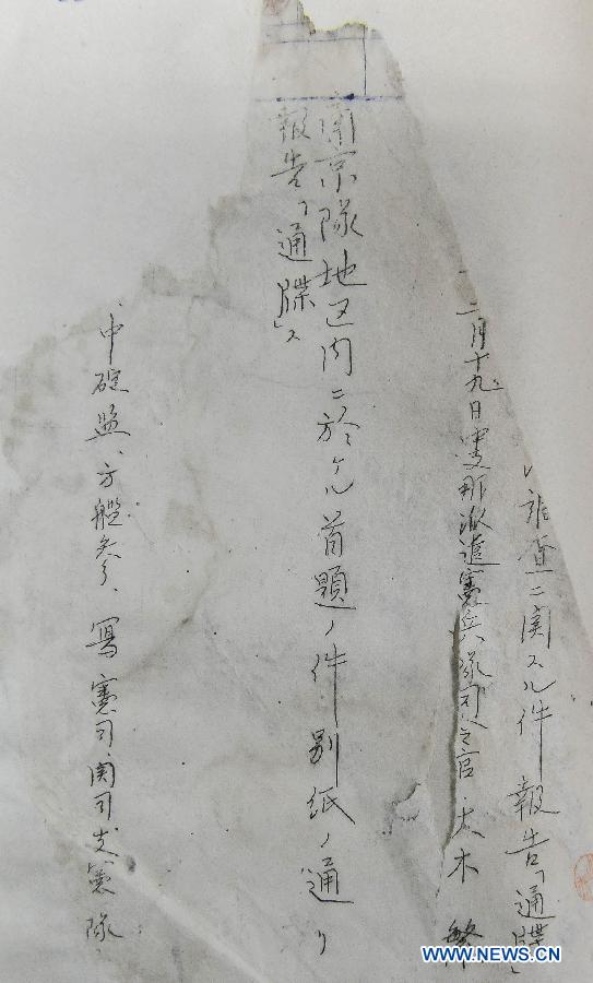 Photo taken on Jan. 7, 2013 shows a newfound report on Feb. 19, 1938 about public order in Nanjing by the military police of Japan's Central China Expeditionary Army in Changchun, capital of northeast China's Jilin Province. Two newfound reports show that the population of Nanjing reduced from 1,130,000 to 345,000 during the two and a half months before and after the Nanjing Massacre. At least 300,000 Chinese were killed over the course of six weeks by Japanese invaders after the soldiers occupied the city of Nanjing in east China's Jiangsu Province on Dec. 13, 1937. (Xinhua/Wang Haofei)