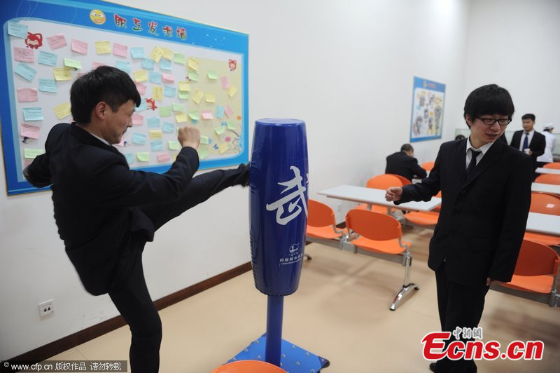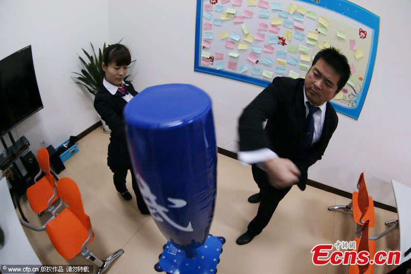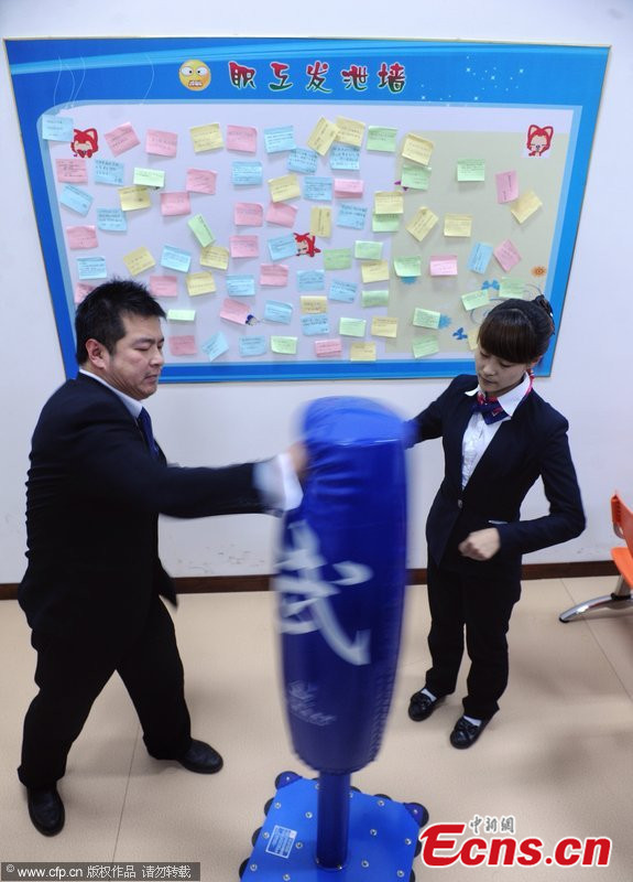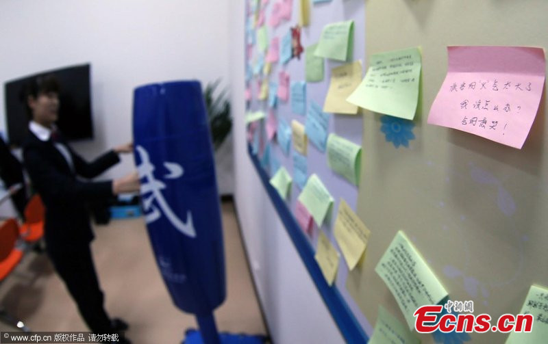 The customer service center of 12306.cn, China's official website for booking train tickets, has set up a special "venting wall" at the company's cafeteria in an effort to help employees relieve stress. It is already covered in colorful stickers with stress relieving tips. There is also a punching bag near the wall, specially designed for customer service workers to hit after answering complaint calls from customers. [Photo/CFP]