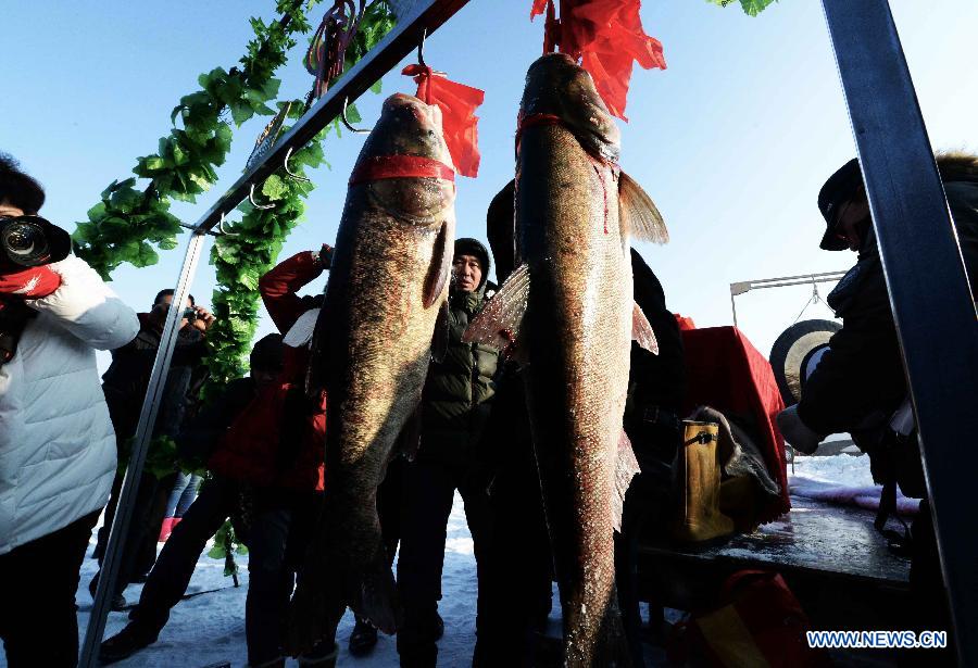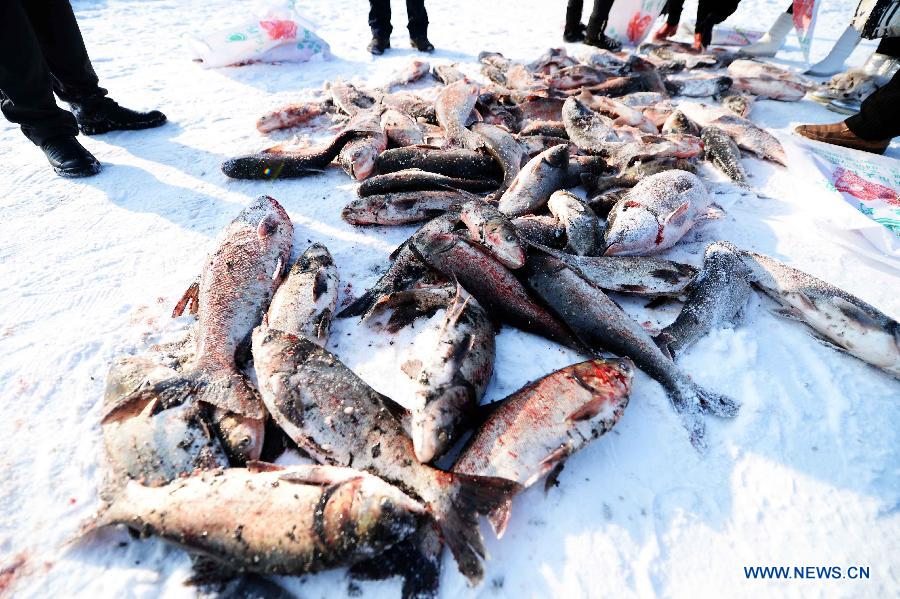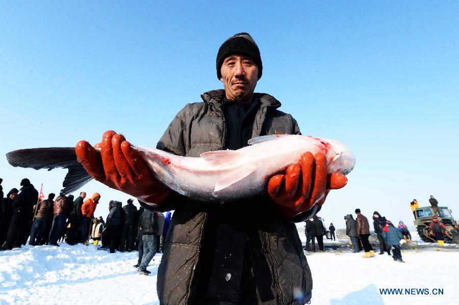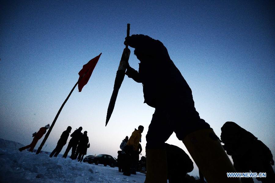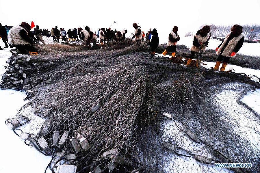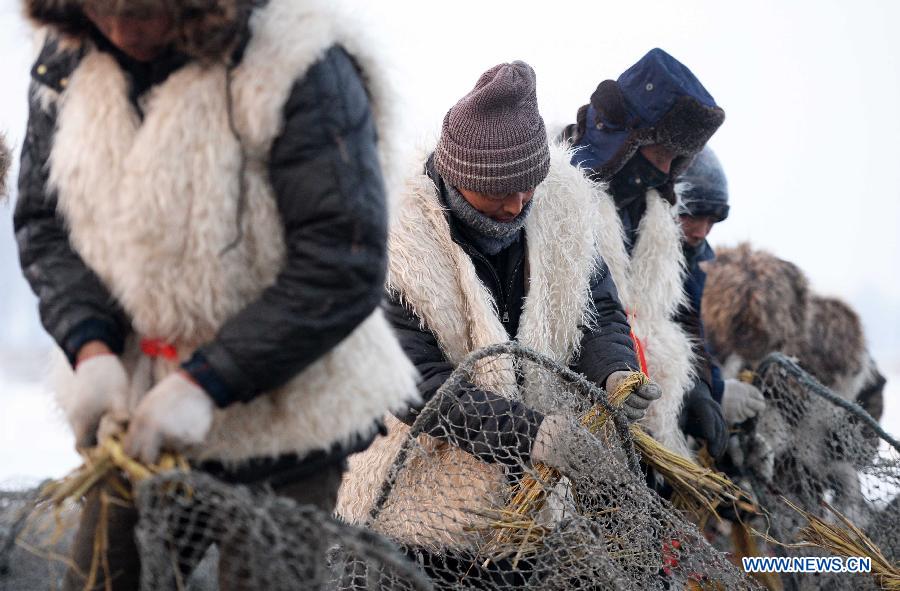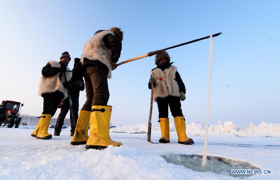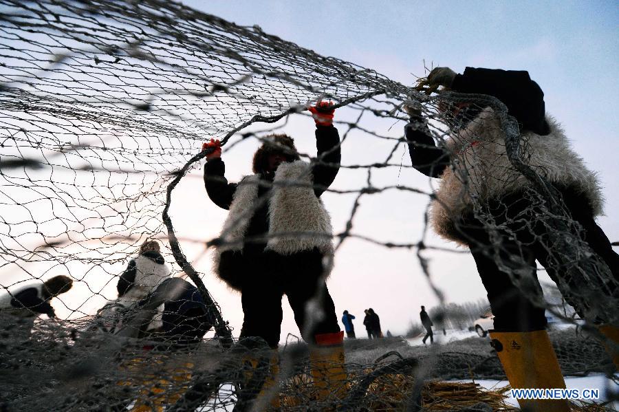 Fishermen check the net on the ice-covered Songhua River in Zhaodong City, northeast China's Heilongjiang province, Jan 7, 2014. The winter fishing started in chilly weather with 30 degrees Celsius below zero. (Xinhua/Wang Kai)
