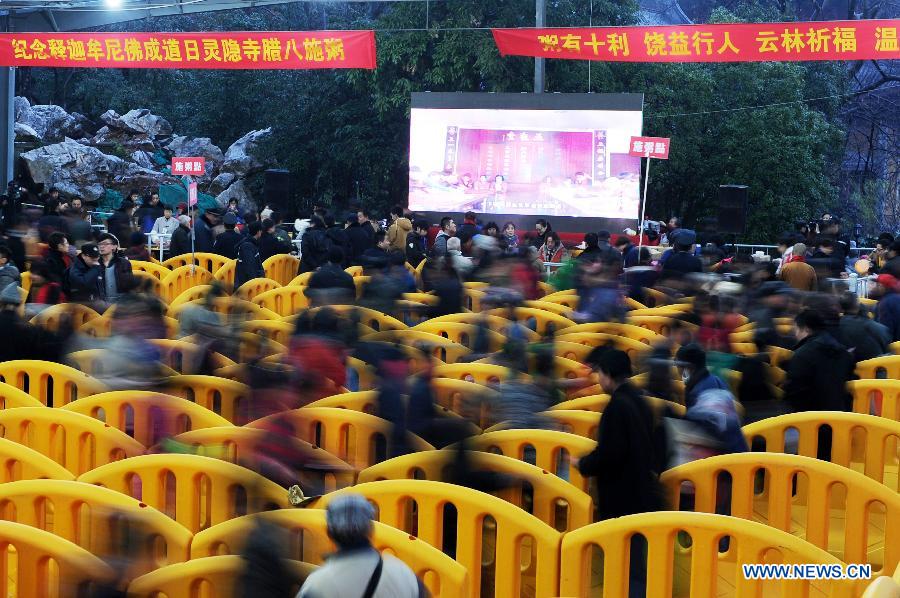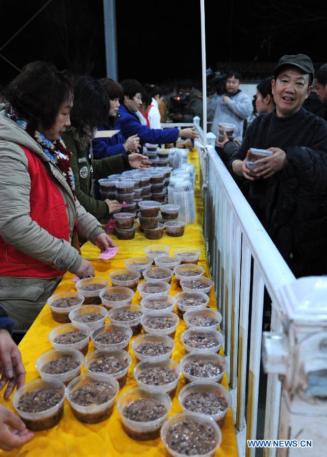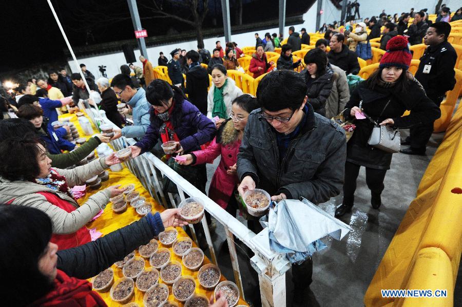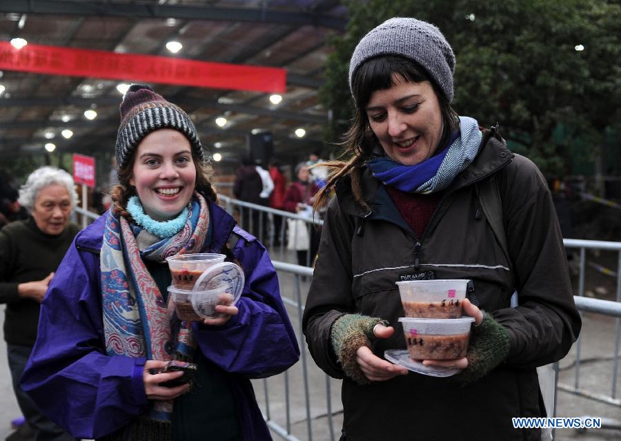 British tourists get free laba porridge, a kind of rice porridge with nuts and dried fruits, at the Lingyin Temple in Hangzhou, capital of east China's Zhejiang province, Jan 8, 2014. Chinese have the tradition to eat laba porridge on the eighth day of the 12th lunar month, which falls on Jan 8 this year. (Xinhua/Ju Huanzong)