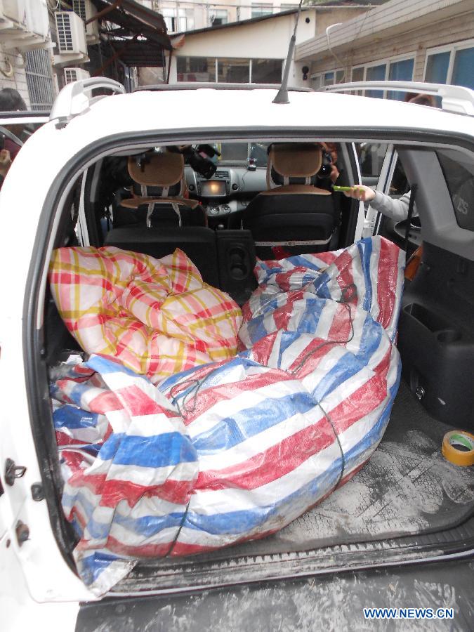 Photo taken on Jan. 8, 2014 shows a tiger in a woven bag in downtown Wenzhou City, east China's Zhejiang Province. An alleged amur tiger was found dead in downtown Wenzhou, the owner of which was summoned by local police for further investigation. (Xinhua)