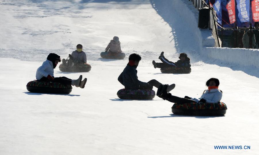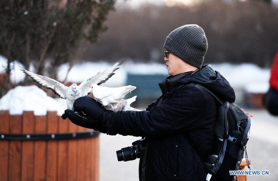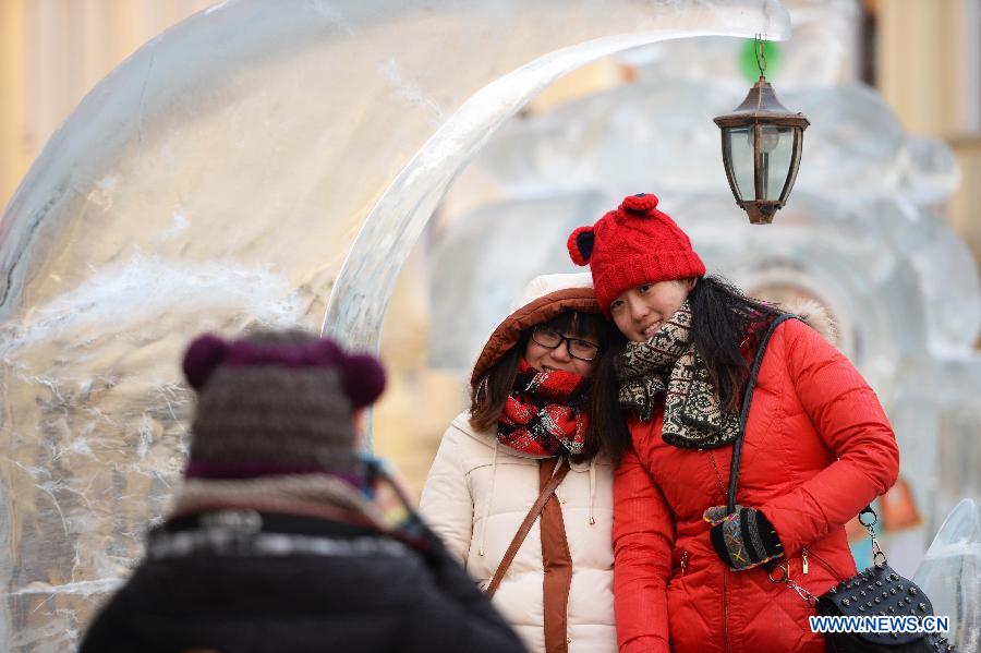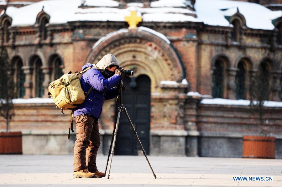 A photographer takes photos at the Sophia Cathedral in Harbin, capital of northeast China's Heilongjiang Province, Jan. 8, 2014. People enjoy ice and snow sceneries in Harbin, the northmost capital city of China. (Xinhua/Wang Kai)