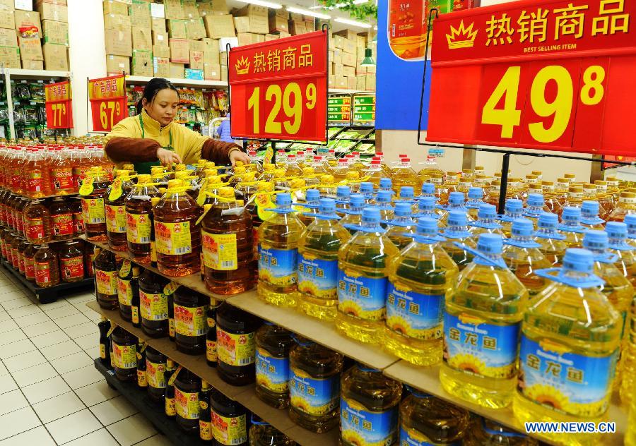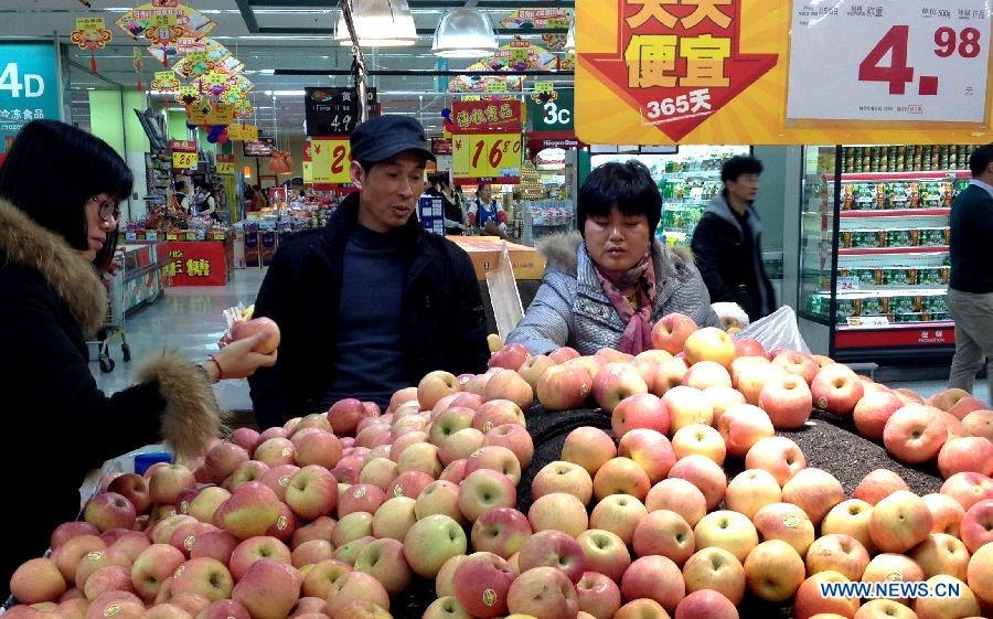 Consumers select meat products at a supermarket in Hefei, capital of east China's Anhui province, Jan 9, 2013. China's consumer price index (CPI) grew 2.5 percent year on year in December, and 2.6 percent for the whole of 2013, well below the government's full-year target of 3.5 percent, the National Bureau of Statistics (NBS) said Thursday. December's CPI, a main gauge of inflation, was 0.5 percentage points lower than the previous month. (Xinhua/Du Yu)