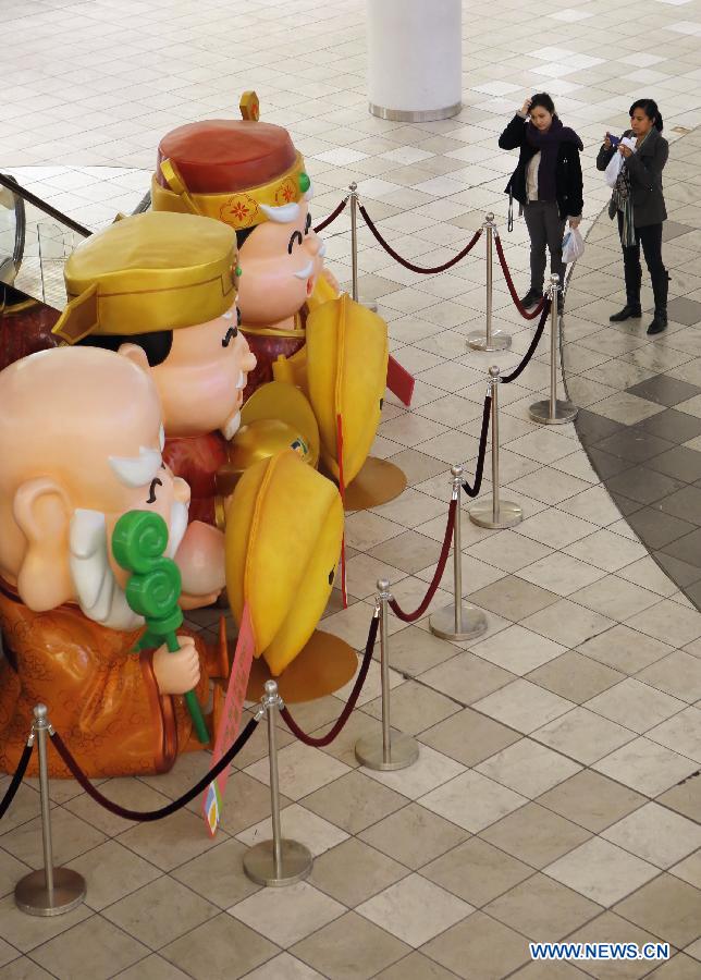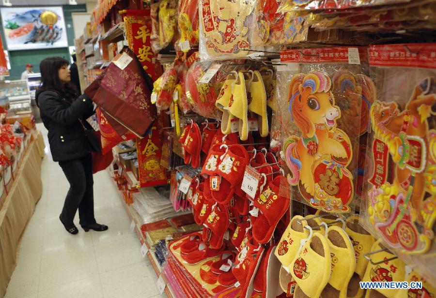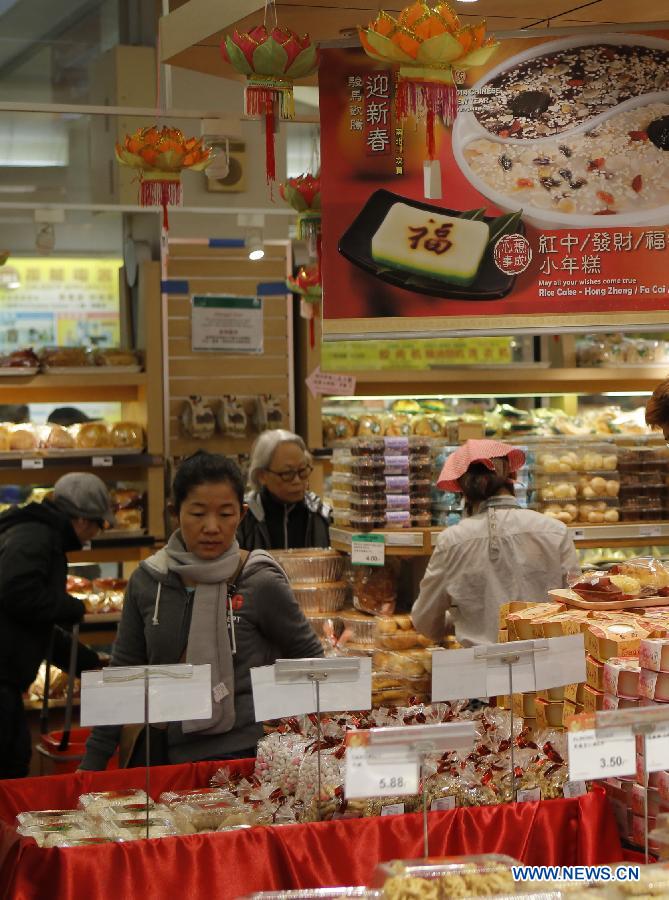 Residents shop for Chinese New Year goods at a store in Richmond, Canada, Jan 8, 2014. As the Lunar New Year is getting closer, Chinese communities follow the tradition to shop for the new year goods. Decorations are seen everywhere, adding an atmosphere of Chinese New Year. (Xinhua/Liang Sen)