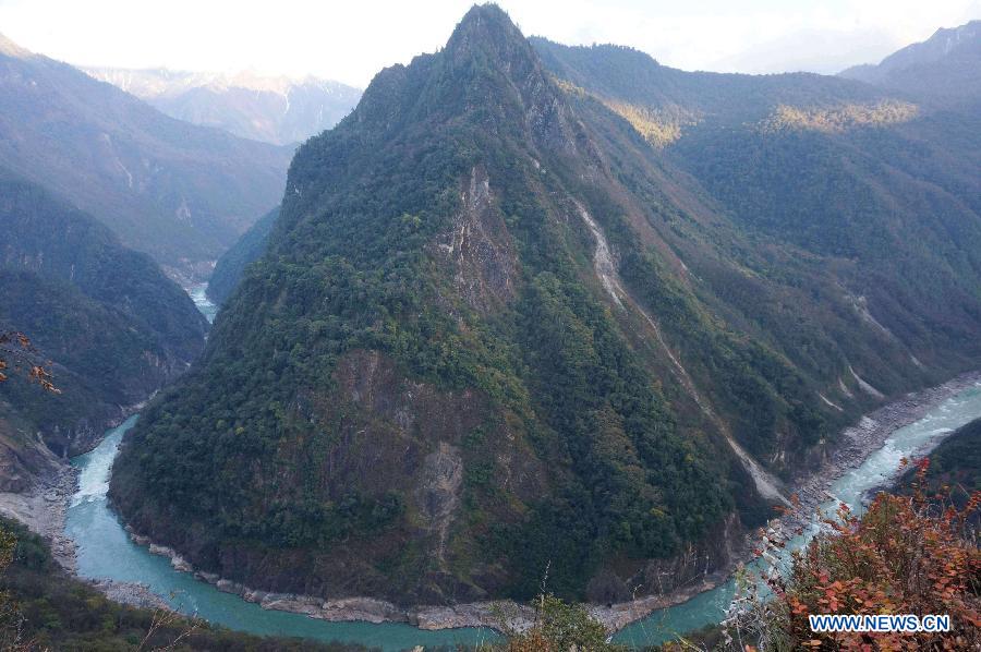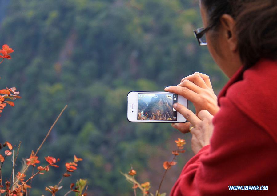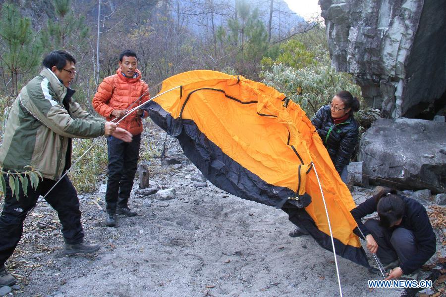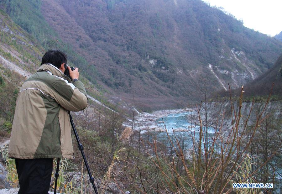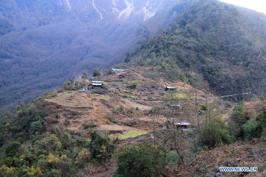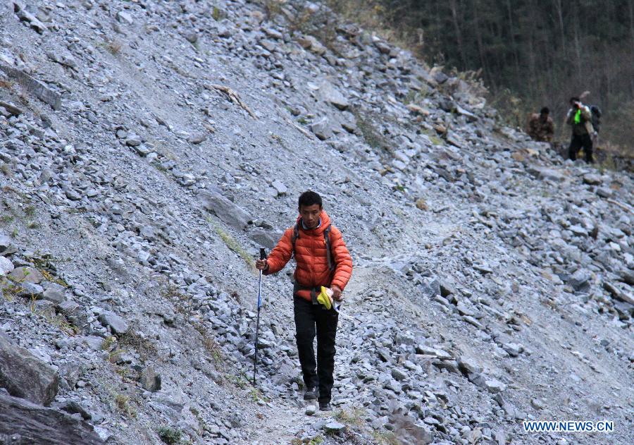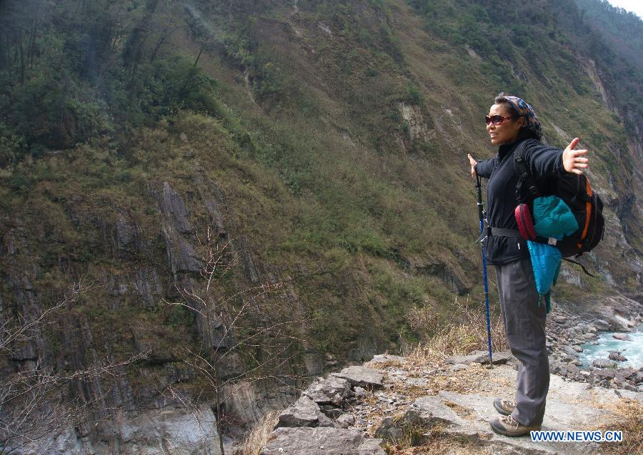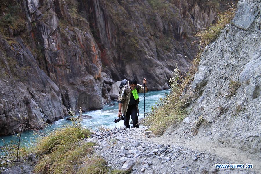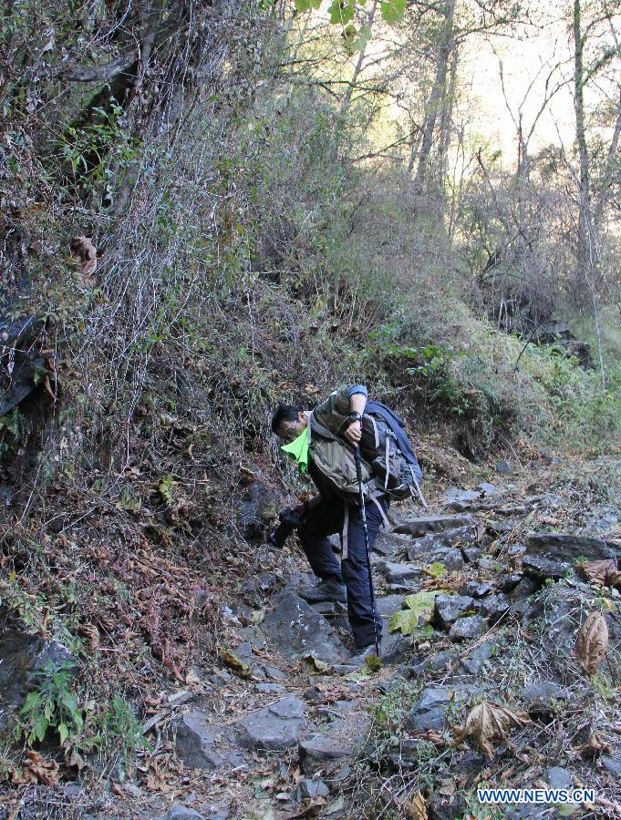 Dainzin, leader of hikers, walks in the area of Yarlung Zangbo River Grand Canyon in Nyingchi, southwest China's Tibet Autonomous Region, Jan. 4, 2014. Yarlung Zangbo River Grand Canyon is regarded as the deepest canyon in world, and is slightly longer than the Grand Canyon in the United States, the symbolic scenery of which is the U-shaped Great Bend near Nyingchi County. (Xinhua/Wang Yunjia)