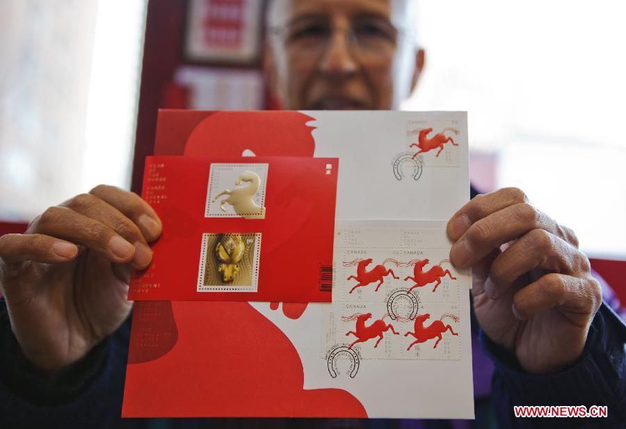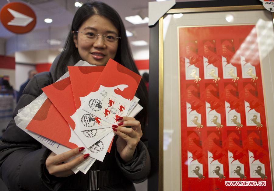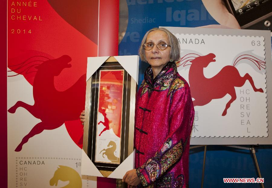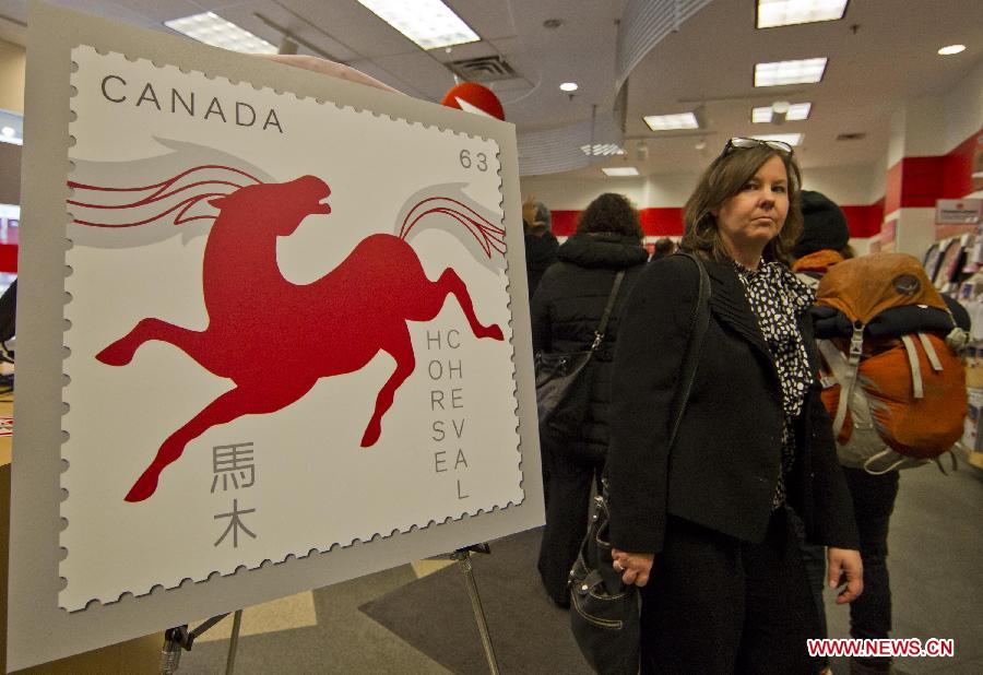 A poster promoting stamps of the Year of the Horse is on display at a post office in Toronto, Jan. 13, 2014. Canada Post issued the Year of the Horse domestic and international rate stamps and collectibles on Monday in celebration of the upcoming Chinese Lunar Year of the Horse. (Xinhua/Zou Zheng)