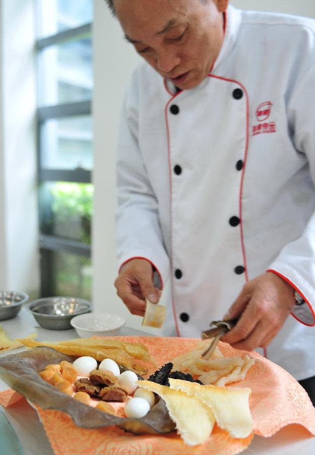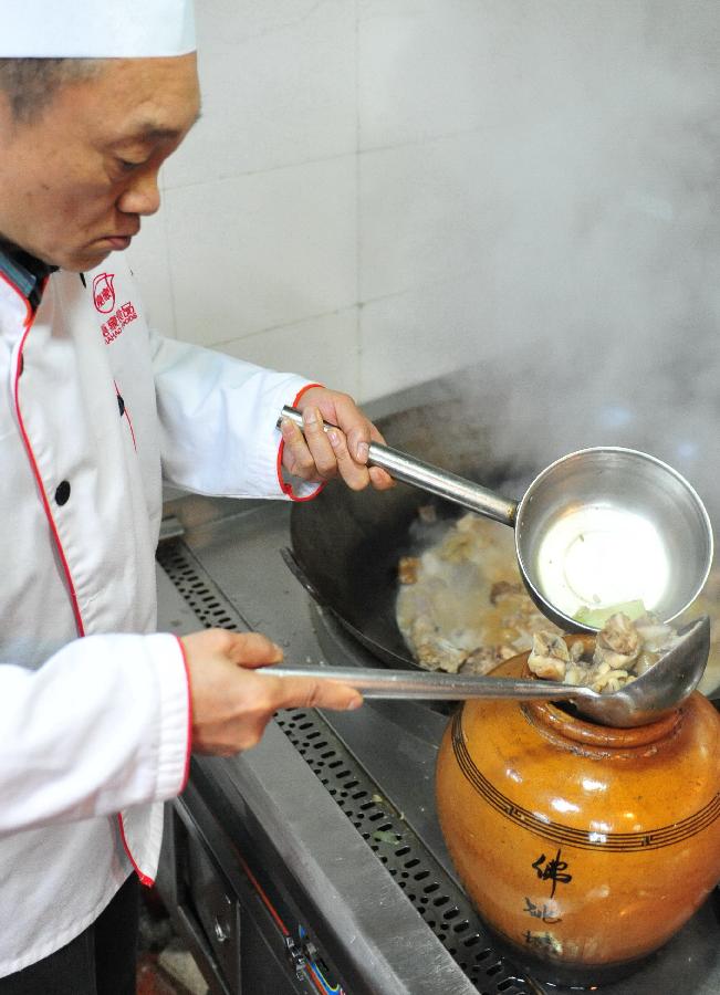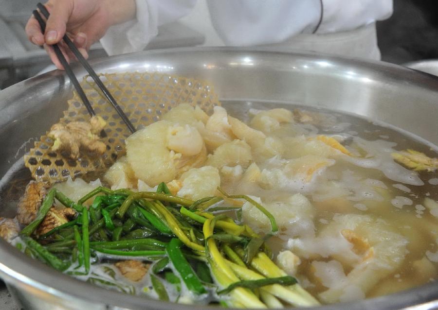 Photo taken on Jan. 12, 2014 shows the ingredients of a dish named Buddha Jumps Over the Wall, in Fuzhou, capital of southeast China's Fujian Province. Buddha Jumps Over the Wall, or Fo Tiao Qiang in Chinese, is a kind of soup or stew which has enjoyed a over 100-year-long worldwide reputation since it was invented in the late Qing Dynasty (1644-1911) by Zheng Chunfa, a chief chef at a local restaurant. The dish's name is referred to an allusion to its ability to entice the vegetarian monks to partake in the meat-based dish from their temples. Ingredients of the dish consists of sea cucumber, abalone, fish fin, etc, owing to which, it smells mellow and tastes extremely delicious with a high nutrition at the same time. (Xinhua/Lin Shanchuan)