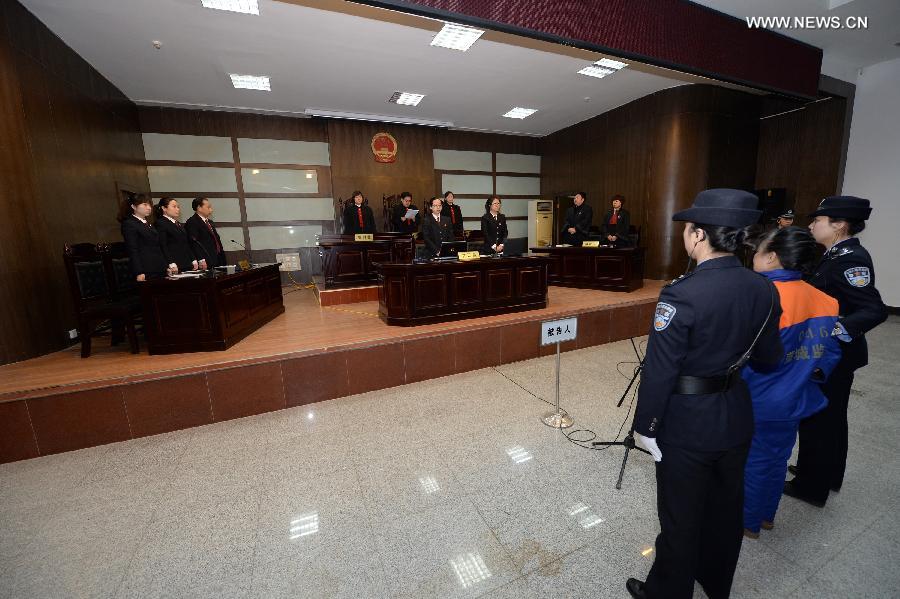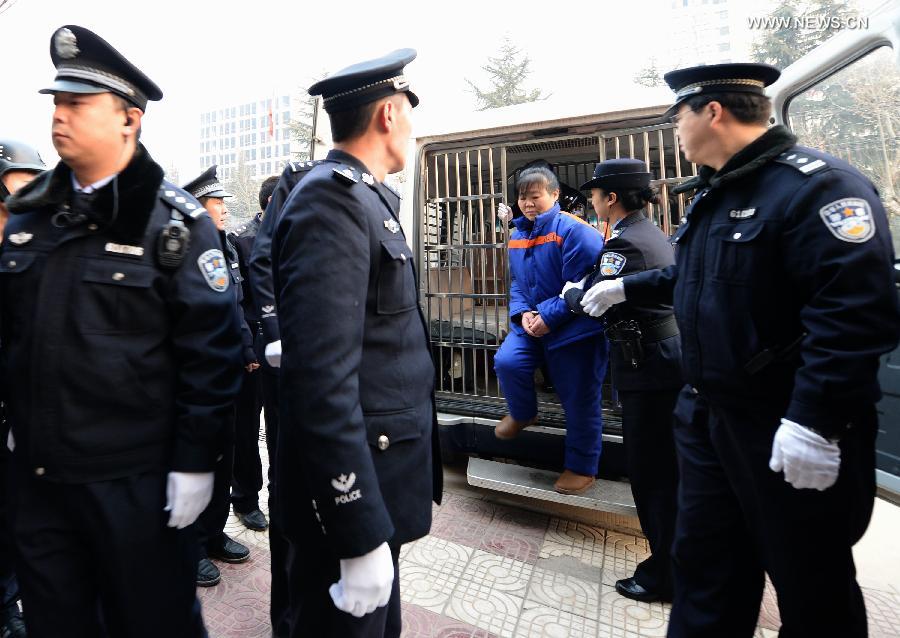 Zhang Shuxia (2nd R), an obstetrician in northwest China's Shaanxi province, who is involved in a baby trafficking scandal, is escorted off the Weinan Intermediate People's Court in Weinan, Shaanxi province, Jan 14, 2014. Zhang was sentenced to death with a two years' reprieve on Tuesday for trafficking seven babies, a local court said. (Xinhua/Li Yibo)
