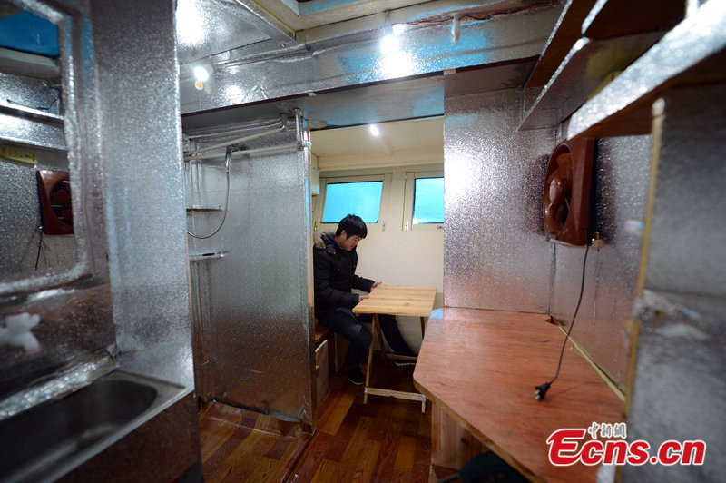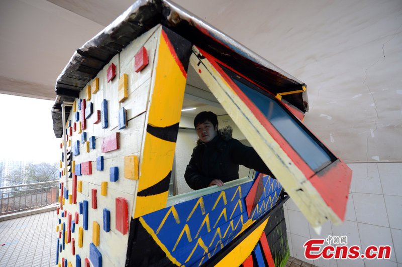 Students of Changsha Nanfang Professional College built a five-square-meter mobile house for a total of less than 10,000 yuan in Changsha of central China's Hunan province. A total of 14 students spent over three months finishing the house, which has a kitchen, bedroom and a bathroom. Photo taken on Jan. 11, 2014 shows the colorfully-painted house, which can be moved around with six heels. [Photo/CFP]