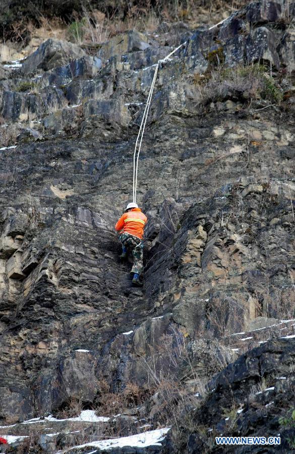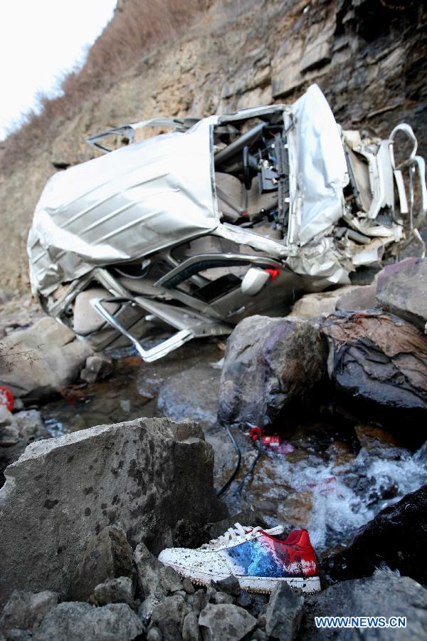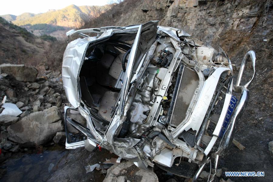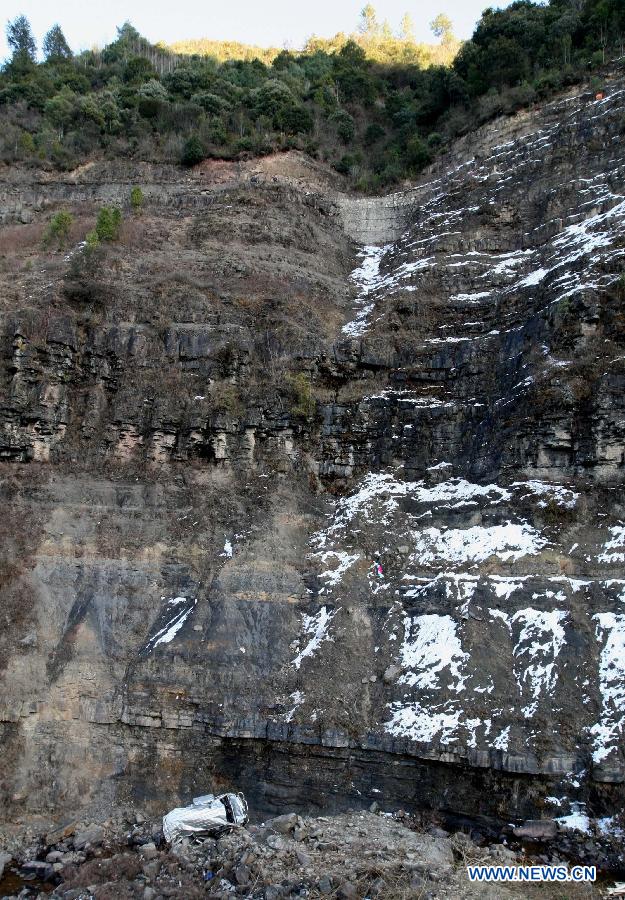 A rescuer works at a minibus crash accident site in Luquan County, Kunming City, capital of southwest China's Yunnan Province, Jan. 15, 2014. A mini bus veered off a rural road and plummeted 100 meters into a ditch at around 8:50 a.m. Wednesday in Luquan County of Kunming City. All 12 people on board died. Local authorities are investigating the accident. (Xinhua/Zhou Can)