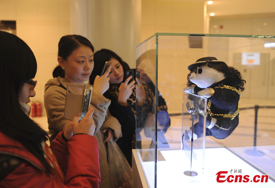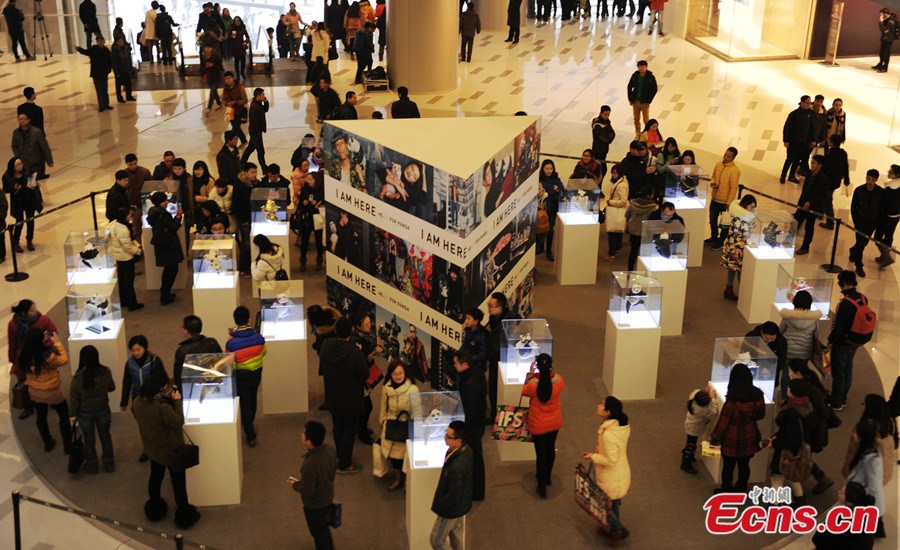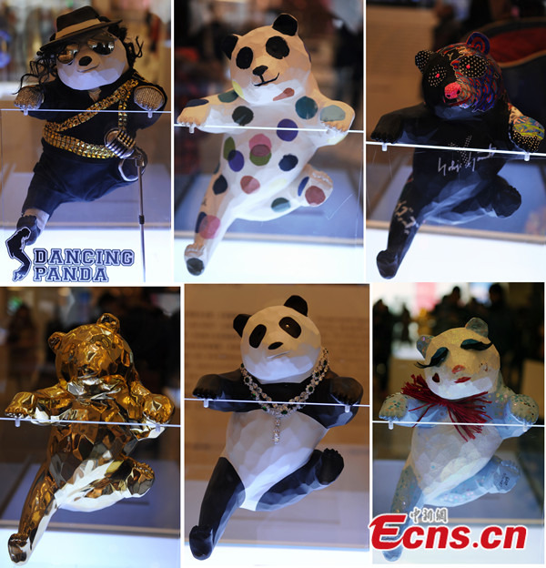A charity exhibition, featuring stylish panda sculptures, is held at Chengdu IFS in southwest China's Sichuan province on Jan. 14, 2014. The 20 panda sculptures, designed by 20 celebrities and fashion leaders, will be auctioned to raise money for a giant panda disease and control center in Dujiangyan. [Photo: China News Service / Liu Zhongjun]