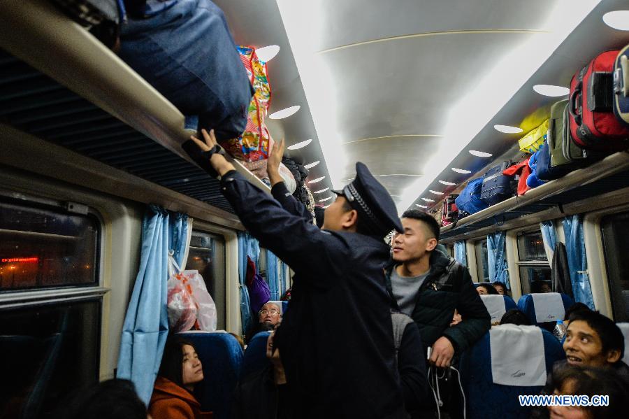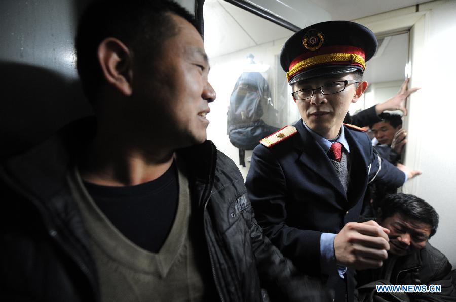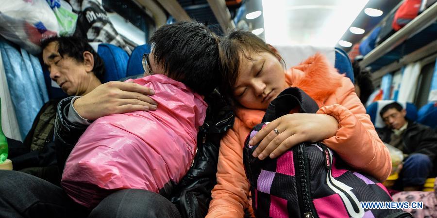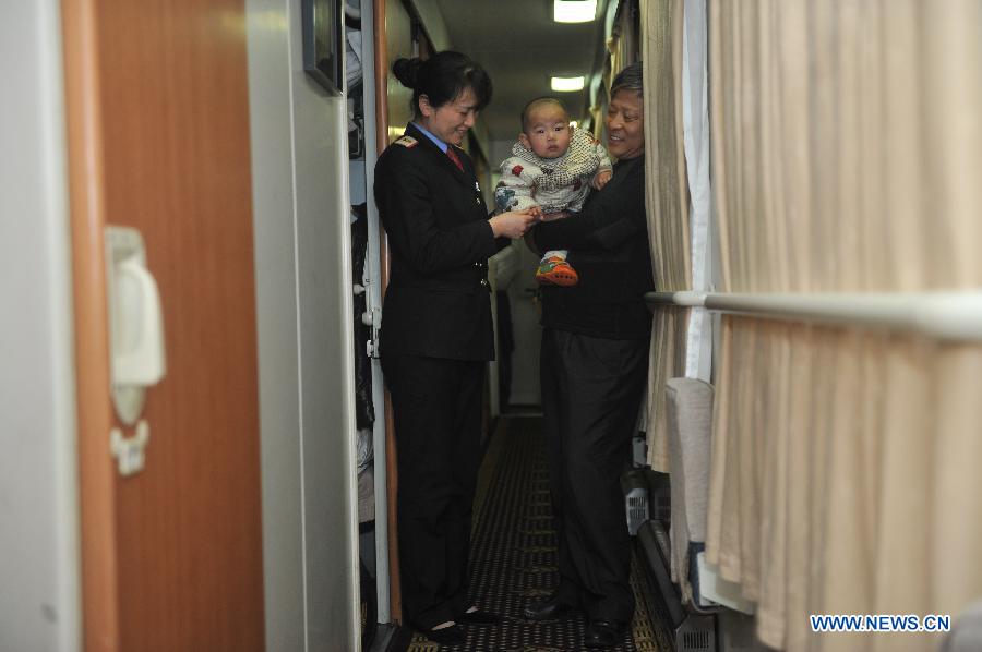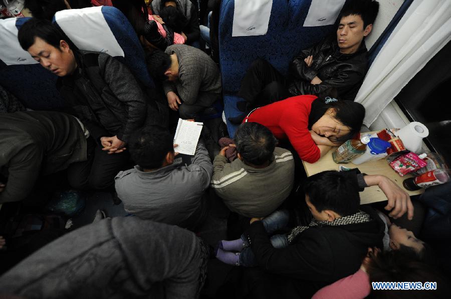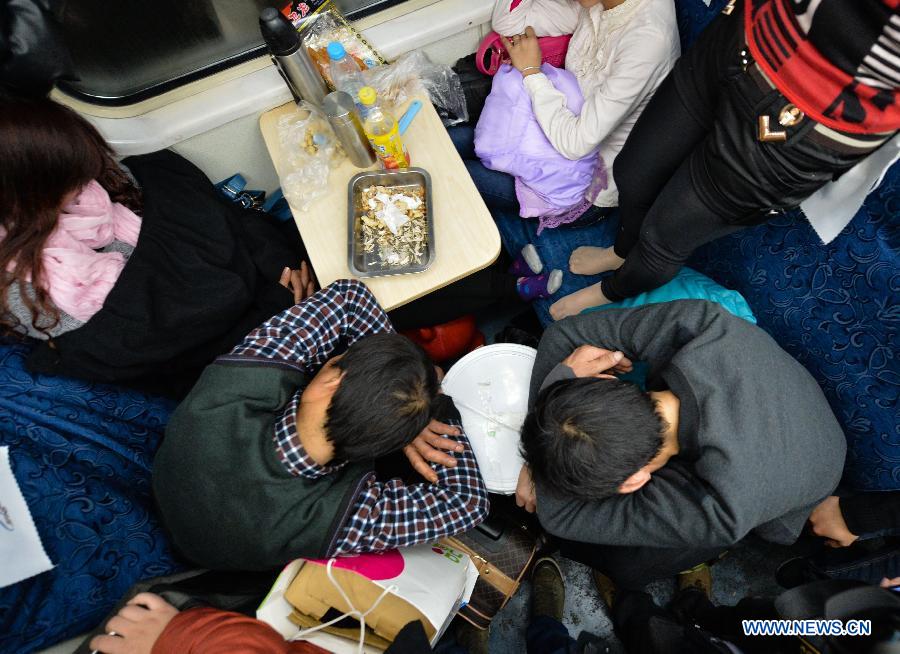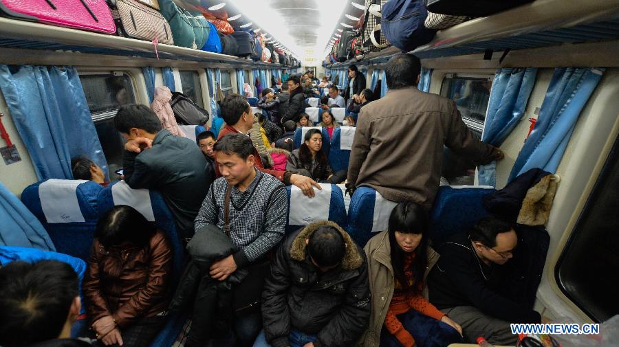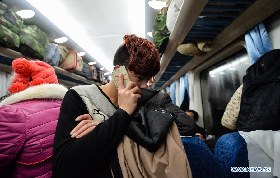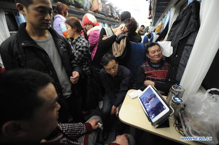 Passengers of K722 from Nanjing to east Chengdu watch programs on a tablet computer on the train departuring from Hankou of Wuhan City, capital of central China's Hubei province, Jan 16, 2014. The 2014 Spring Festival travel rush of China started on the wee hours of Thursday. (Xinhua/Han Yuqing)