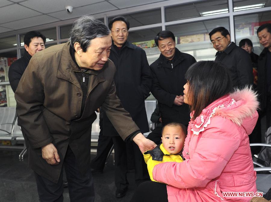 Chinese Vice Premier Ma Kai (front, 2nd L) talks to a passenger at the Capital Airport in Beijing, capital of China, Jan. 16, 2014. Ma inspected the work for the Spring Festival travel rush in Beijing on Thursday. (Xinhua/Rao Aimin)