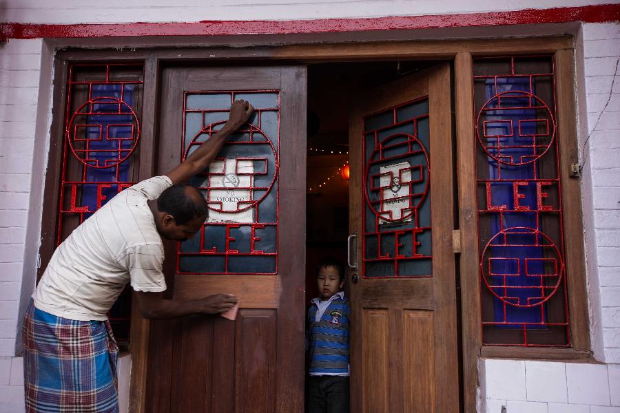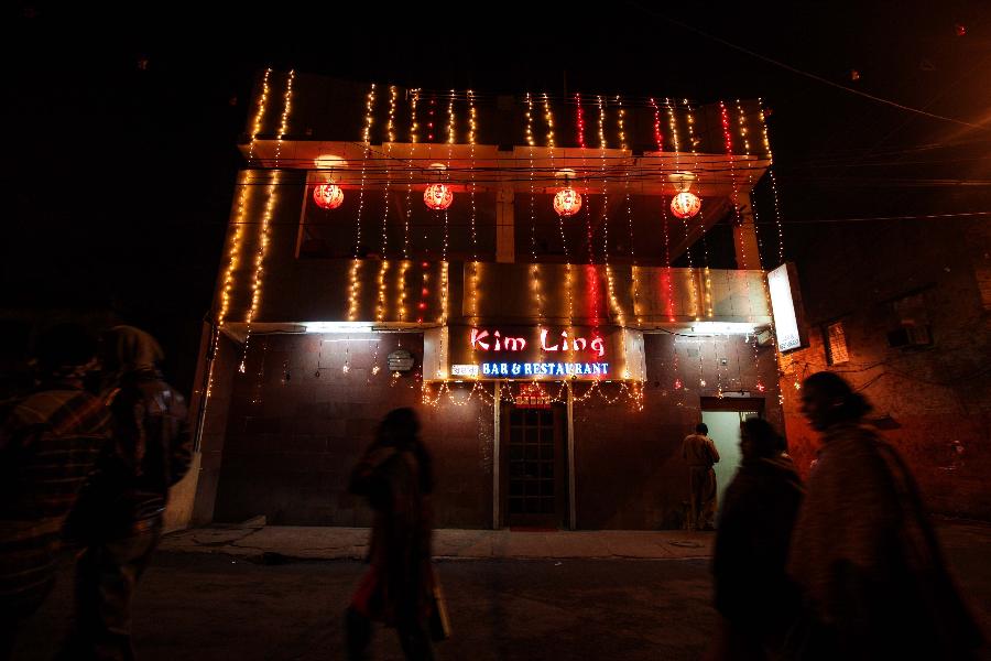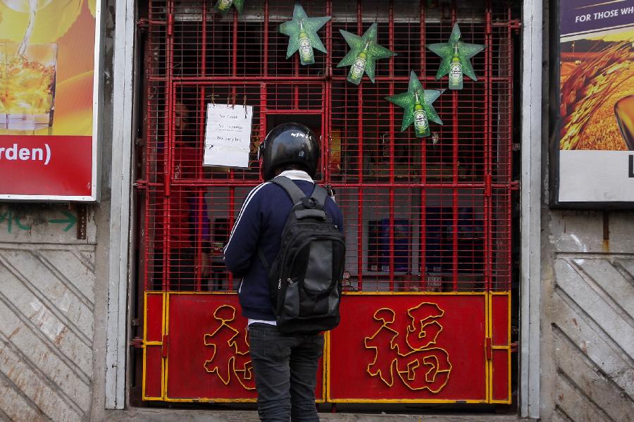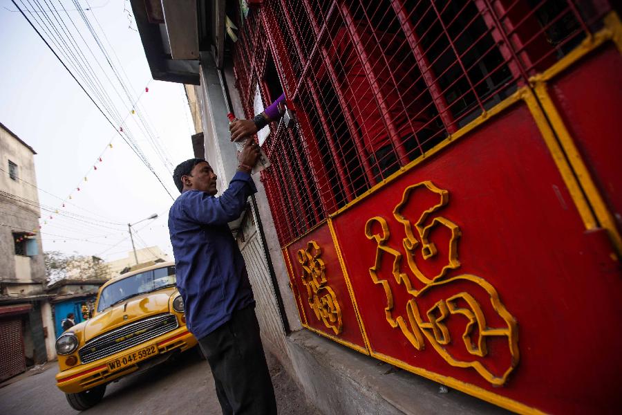 A man buys liquor at a shop decorated with Chinese characters meaning "fortune" at the Tangra Chinatown of Kolkata, West Bengal State of India, Jan. 16, 2014. As the Chinese Spring Festival is drawing near, people in the Tangra Chinatown of Kolkata started to decorate their community for the festival. The Tangra Chinatown is one of the main Chinese overseas communities in India. (Xinhua/Zheng Huansong)