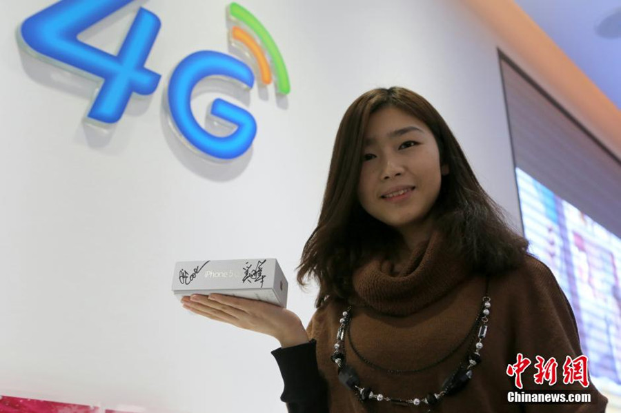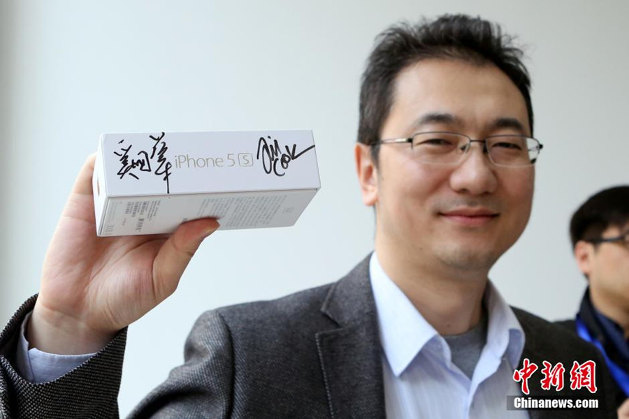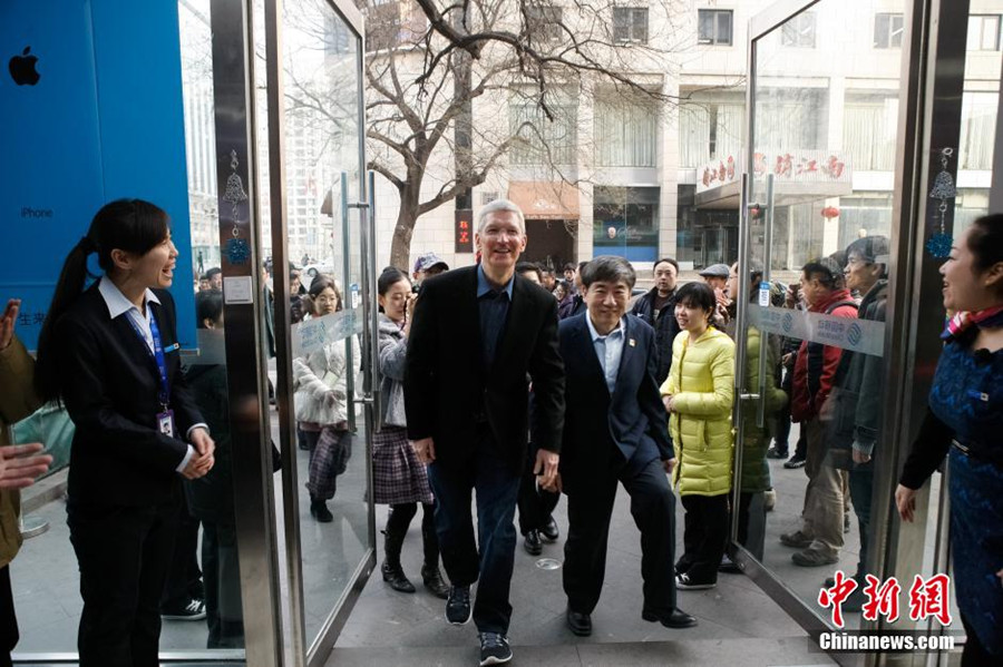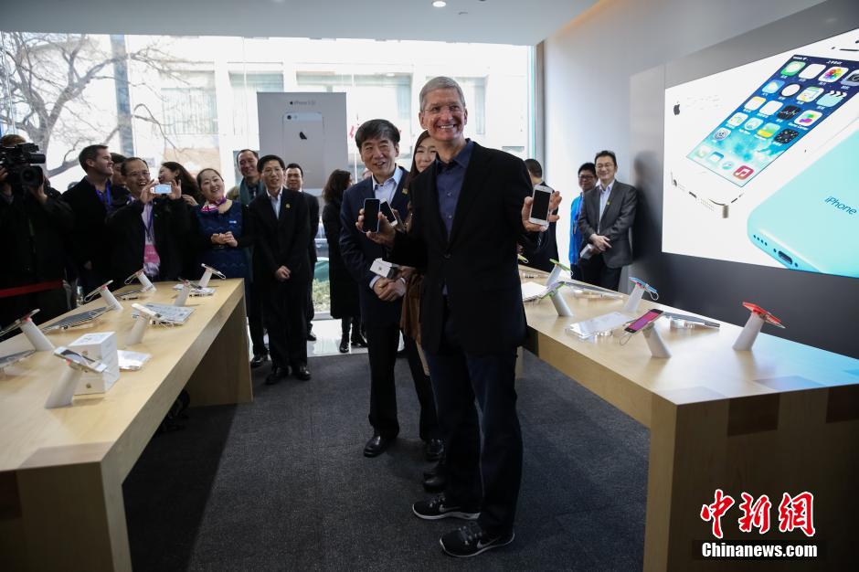 China Mobile chairman Xi Guohua accompanies Apple CEO Tim Cook to one of the telco’s stores in Beijing to meet and greet this morning’s buyers on Jan 17, 2014. China Mobile and Apple launched iPhones that work with the telcom’s TD-LTE 4G network on Friday, marking a long-awaited link between the world’s No. 1 mobile carrier and a top global technology giant. [Photo: China News Service]