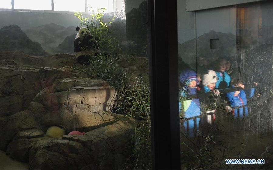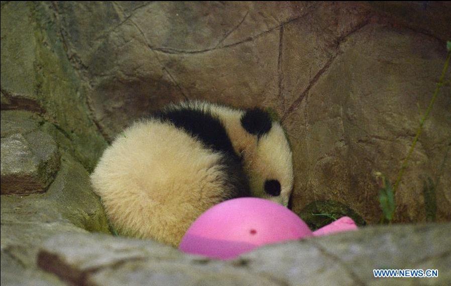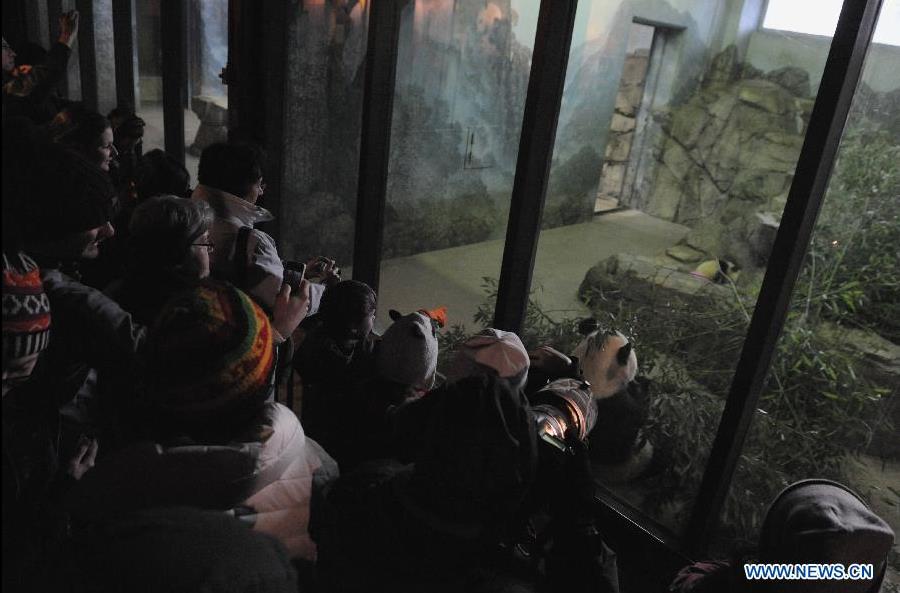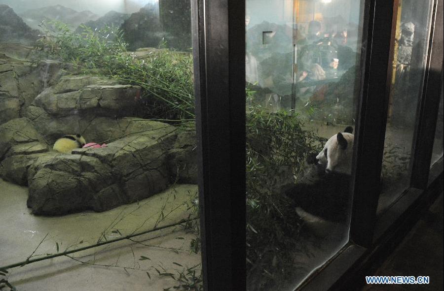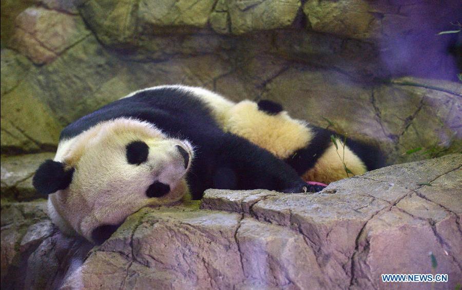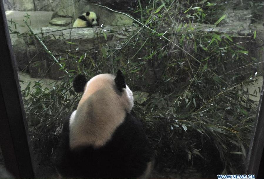 The female giant panda cub "Bao Bao" (Rear) and her mother "Mei Xiang" (Front) are seen in Smithsonian's National Zoo in Washington D.C., the United States, Jan. 18, 2014. "Bao Bao" made her public debut here on Saturday. The giant panda cub was born on Aug. 23, 2013, and received her name "Bao Bao" after a name vote involving global fans. (Xinhua/Yin Bogu)