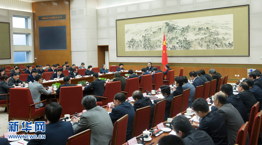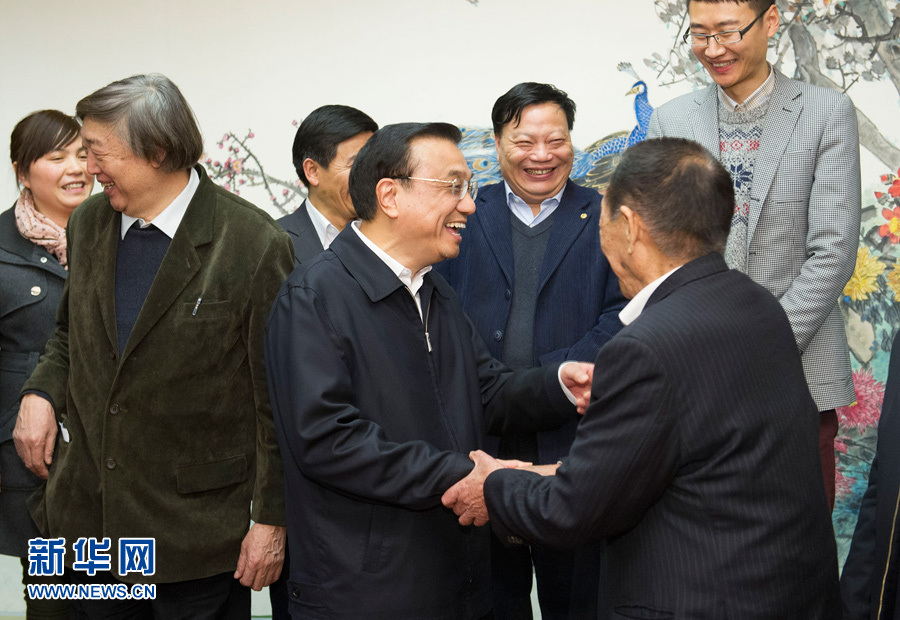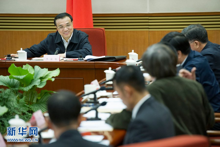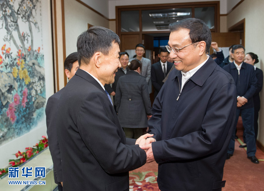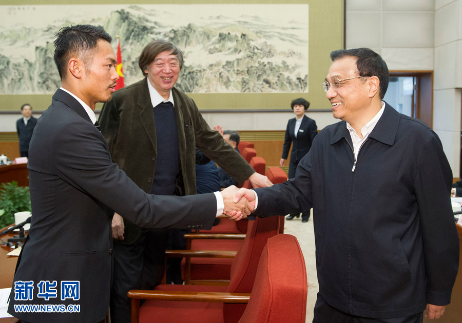 Chinese Premier Li Keqiang (R) talks with badminton star Lin Dan after a forum in Beijing on Jan. 17, 2014. Chinese Premier Li Keqiang listened to people from science, education, culture, medical and sports circles and the public at large while drafting a government work report. A total of 10 representatives shared their views on the government's work in 2013 and made some suggestions to improve the report at a forum held on Friday, according to a circular published on Sunday. The speakers included hybrid rice researcher Yuan Longping, writer Feng Jicai, actor Li Xuejian and badminton star Lin Dan, as well as representatives from universities, hospitals and bookstores, according to the circular. [Photo/Xinhua]