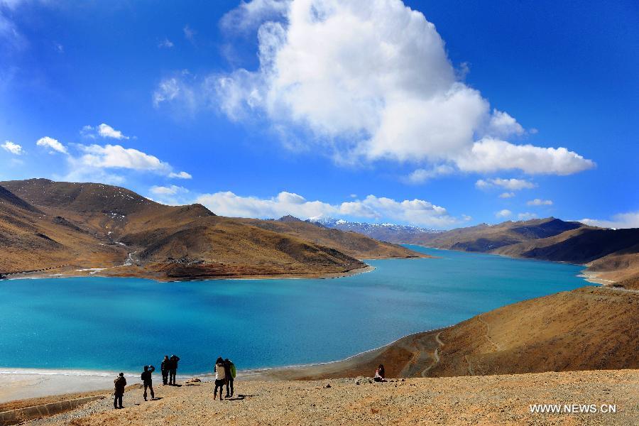 Tourists pose for photos by the side of Yamzho Yumco Lake in Shannan Prefecture, southwest China's Tibet Autonomous Region, Jan. 19, 2014. Yamzho Yumco Lake, considered as one of the three sacred lakes in Tibet, is a good choice of travel destination in winter. (Xinhua/Wen Tao)