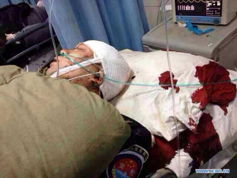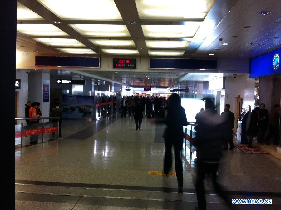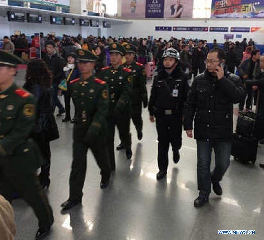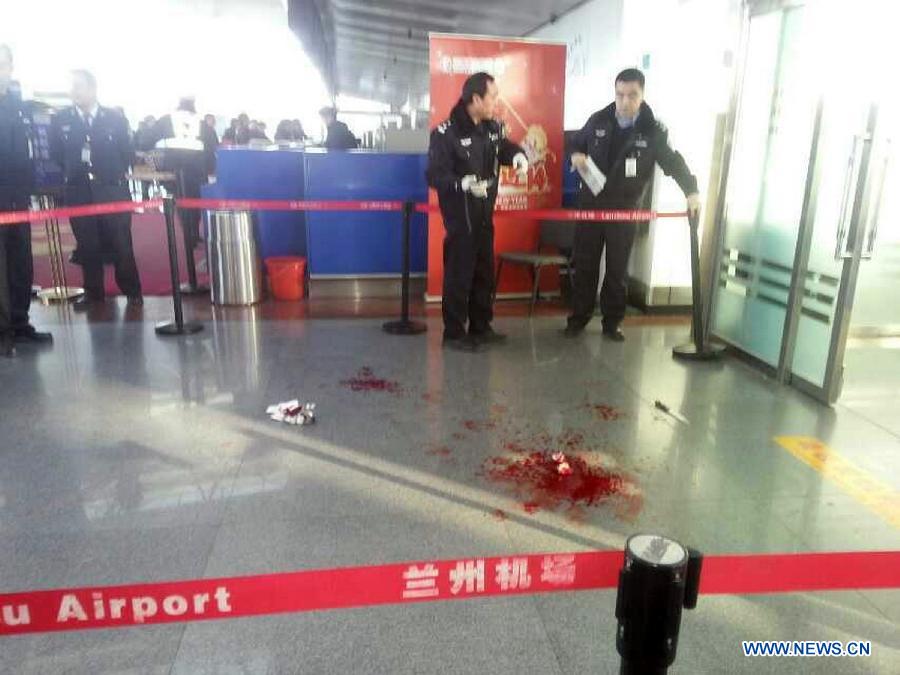 Security personnel are seen at the attack site at Zhongchuan Airport in Lanzhou, capital of northwest China's Ganzhou Province. A knife-wielding man rushed through the security check at Zhongchuan Airport and injured three security staff members at about 9:16 a.m. on Monday. The three injured, two in critical condition, have been taken to a local hospital. The airport has resumed service and flights are operating normally.(Xinhua)