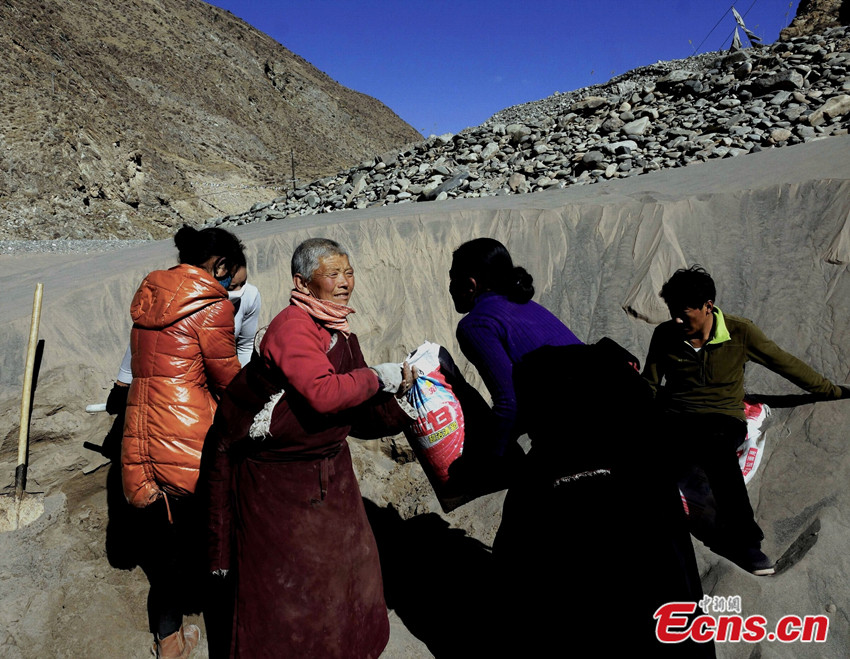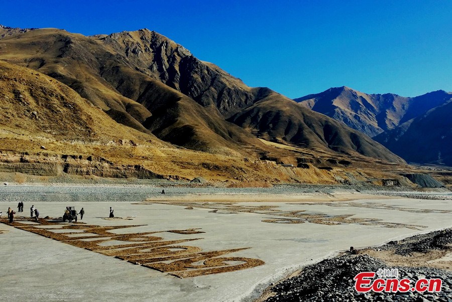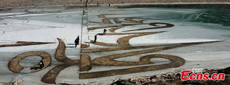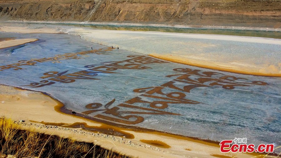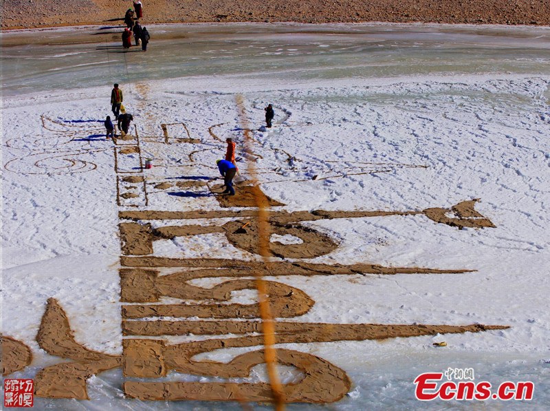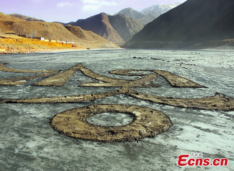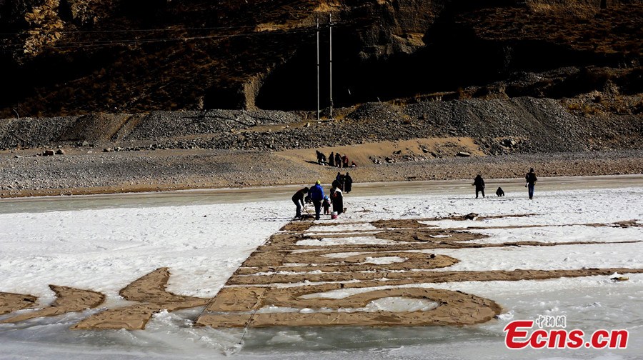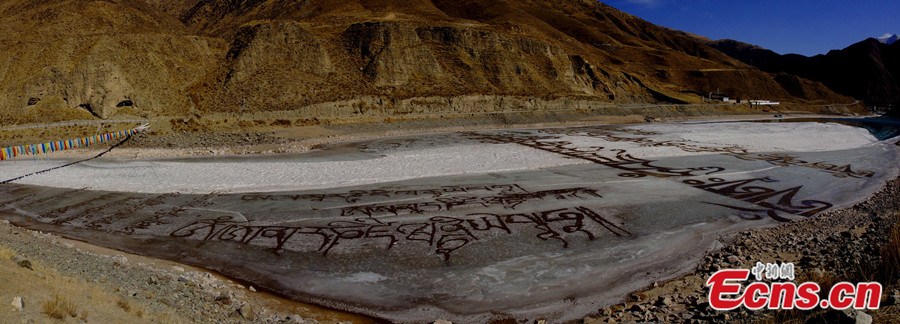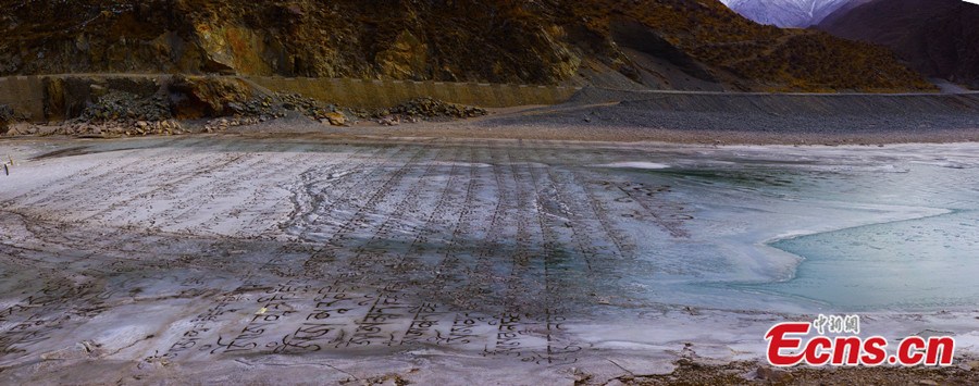 Buddhist mantras are seen on the icy surface of Tongtian River at Yushu Tibetan autonomous prefecture in northwest China's Qinghai Province on Jan. 20, 2014. Local Tibetan people write the Six Syllable Prayer with sands on the icy surface of the river, which is the so-called "sutra bridge". Lines of Tibetan letters are drawn on the ice first; then people carry sands and spread them to fill all the letters. [Photo/China News Service]